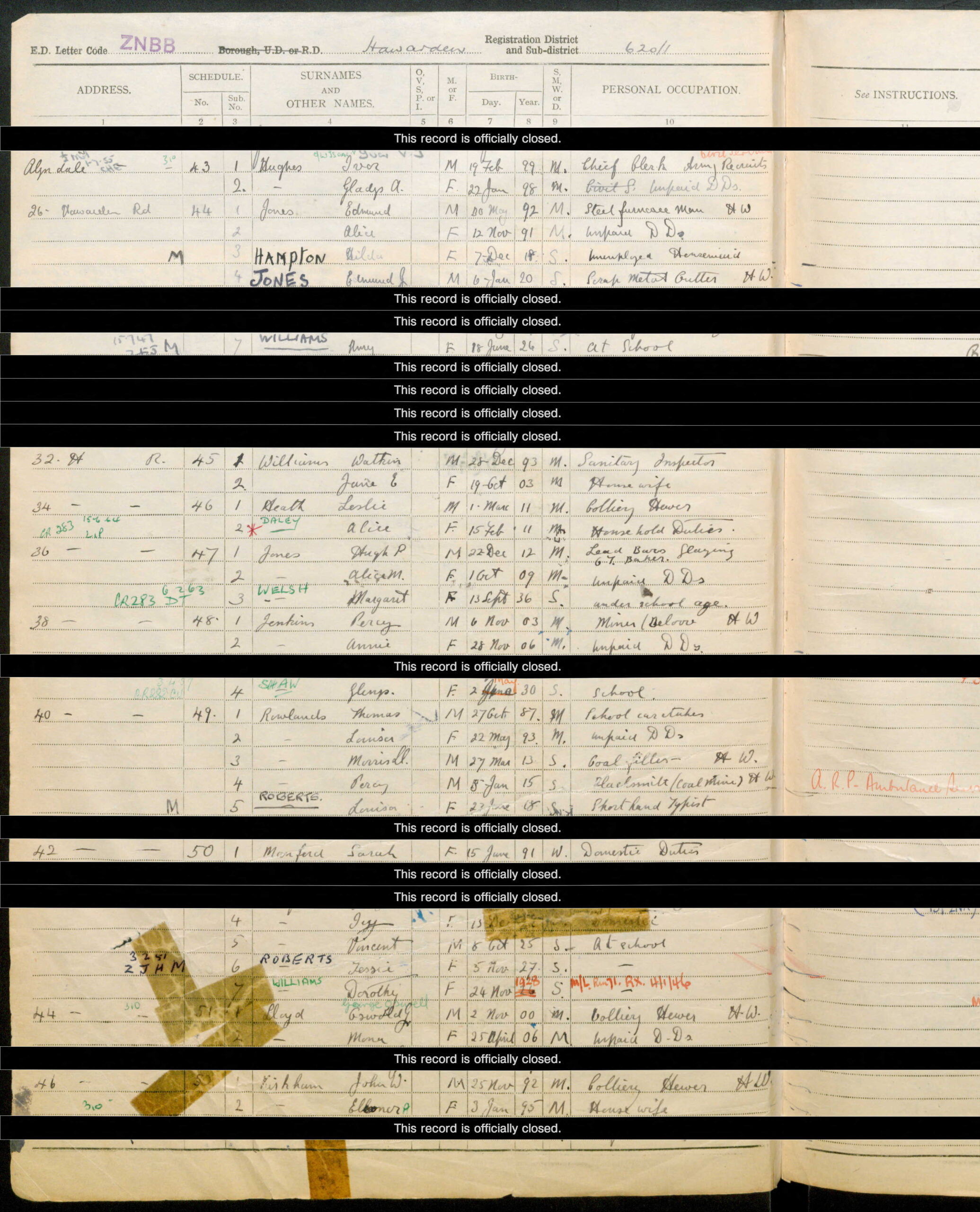 Bernard’s family, in 1939 were living at 26, Hawarden Road, Abermorddu, Caergwrle, Hawarden, Flintshire. The National Register was taken on the 29th September 1939 and it is this source that gives us the dates of birth of all the members of the household, except the retracted or closed records*, of which there are 6 in this household of 11 people.