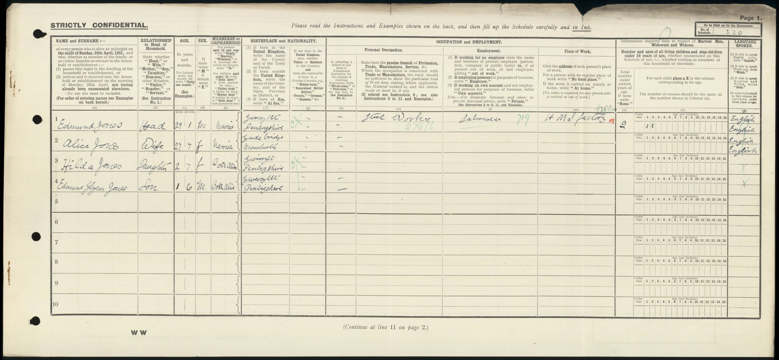 We see Edmund & Alice with 2 children on the 1921 census, which was taken on the 19th of June 1921, living at Davies Cottages, Shotton, (I believe that these were near or around Health Street.). Edmund Jones was the head of the household, 29 years and 1 month old, born in Gwersyllt, Denbighshire, and a Steel Worker at H.M.S. Factory. His wife, Alice Jones was 27 years and 7 months old, and born in Guide Bridge, Manchester. Their children, both born in Gwersyllt, Denbighshire were Hilda Jones. 2 years and 7 months old and Edmund Glynn Jones, 1 year and 6 months old.