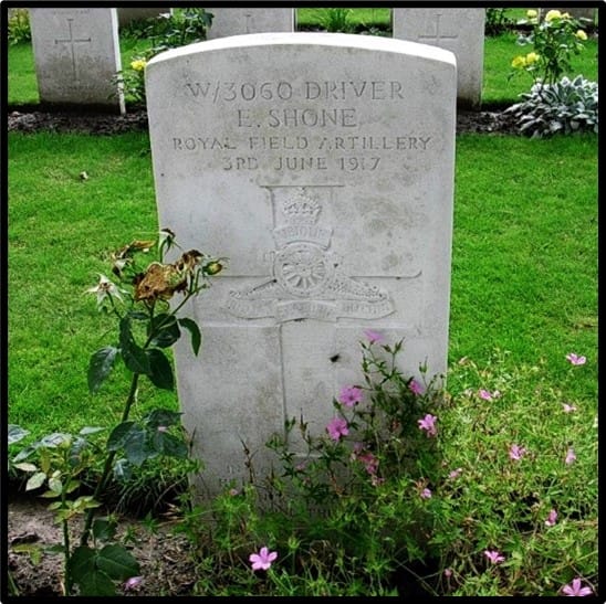 A Pension Index Form on ‘Ancestry’ tell us that Edward left a widow and two children. She was Sarah Ann Shone (DOB 17th July 1888). The two children were Phylis (Born 5th September 1913) and Edward Eric (born 27th October 1914) . Sarah Ann’s address on the Pension Index Card was Ledsoms Houses, Pentrobin, Hawarden. ( One possible recorded marriage is Edward Shone married Sarah A Griffiths in Liverpool March quarter 1912. Sarah A. may have later married Thomas Bellis in 1918).