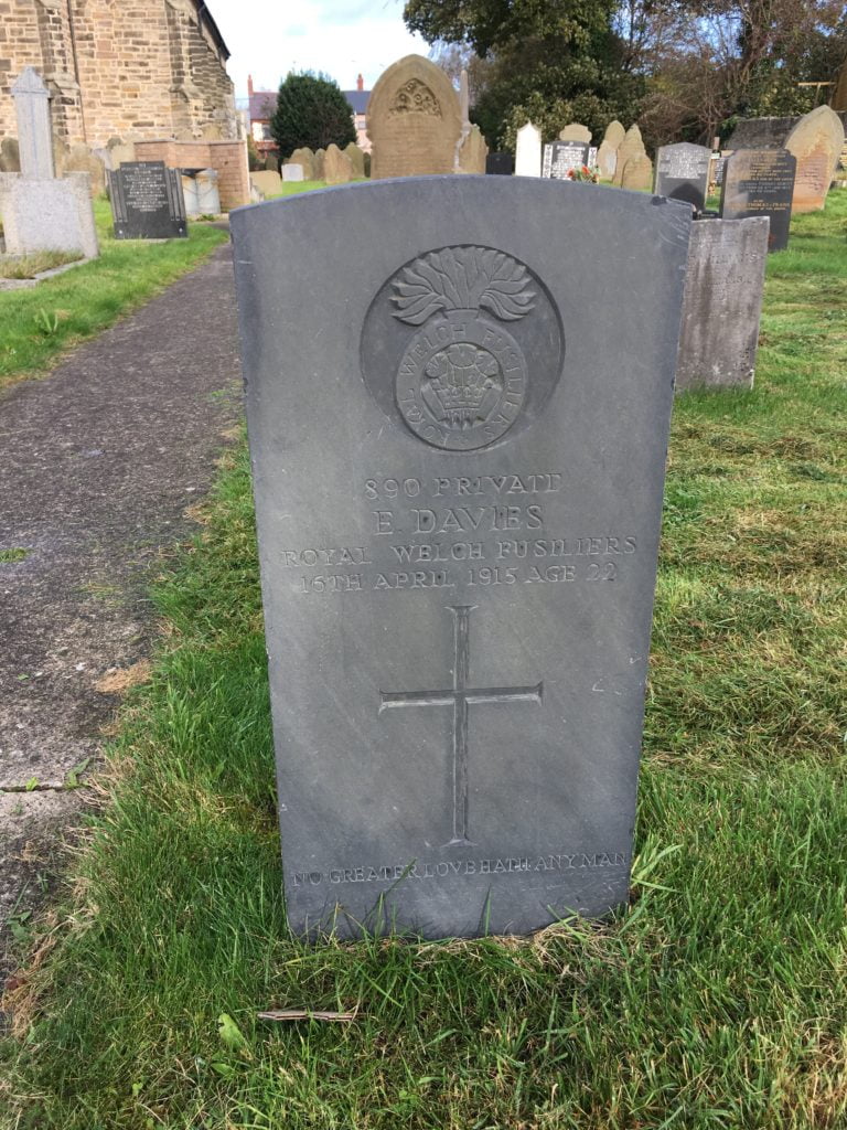 MILITARY FUNERAL. Private Edwin Davies (22), of the 5th Battalion Royal Welch Fusiliers, son of Mr. Edwin Davies, farmer, of Nant Mawr, Buckley, died on Friday night at Northampton Hospital, after an illness of five months’ duration. His body was conveyed home on Monday night, and the funeral took place on Tuesday afternoon, the interment being at Bistre Churchyard. The coffin, which was brought from Nant Mawr on a wheeled bier, was covered with the Union Jack. Members of the Flintshire National Reserve mustered in good force. The Rev. J. E. Morgan (Vicar) and the Rev. J. Sinnett Richards (Curate) officiated. At the close of the service the soldiers fired three volleys over the grave, and the bugler sounded the “Last Post.” The principal mourners were the deceased’s father and mother and seven brothers and sister, and many near relatives. The wreaths, which were numerous and beautiful, included one from deceased’s comrades. The deceased’s father has received letters of sympathy from the King, Lord Kitchener, and Colonel Basil E. Philips (officer commanding the 5th Battalion R.W.F.).