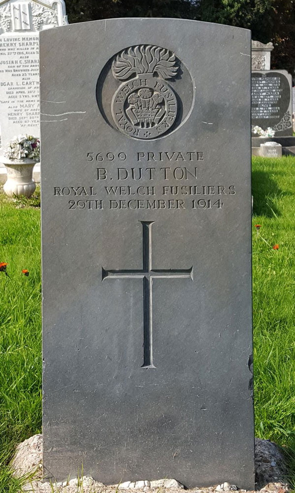 There is a card for Benjamin in the Flintshire Roll of Honour at the County Archive Office in Hawarden. The address given was Cedar House, Ash Grove, Shotton, which, incidentally, was the address of Samuel Welch, who is also remembered on this memorial and was related to Benjamin. The regimental details are quoted as above. It says that Benjamin was a Lance Corporal but army records have him as a Private. The card says he served 4 months and that he died from wounds received in France. The card was signed by Benjamin Dutton his father.