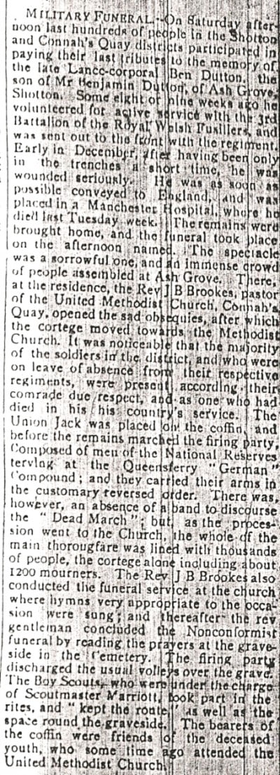 On Saturday afternoon last hundreds of people in the Shotton & Connah’s Quay districts participated in paying their last tributes to the memory of the late Mr. Benjamin Dutton, of Ash Grove, Shotton. Some eight or nine weeks ago he volunteered for active service with the 3rd Battalion of the Royal Welsh Fusiliers, and was sent out to the front with the regiment.