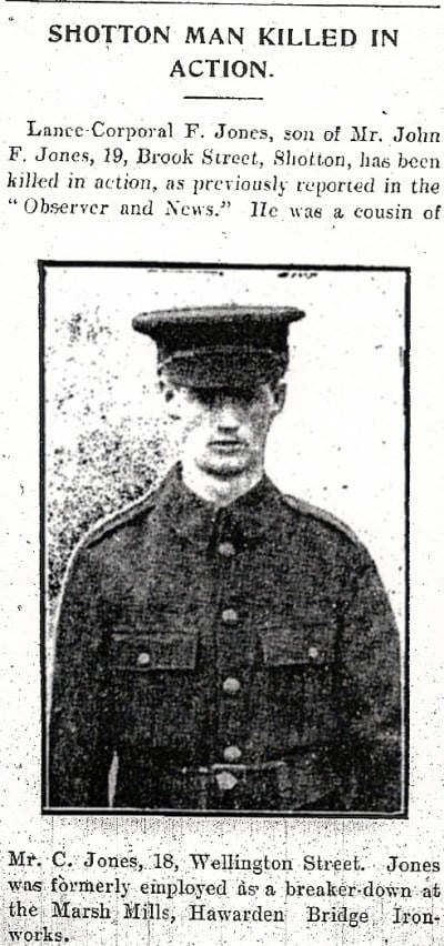 Lance-Corporal John Jones, son* of Mr. & Mrs. Jones, of 18, Wellington Street, Shotton, has been killed at the Dardanelles. He was 25 years of age, and for some time was employed at Hawarden Bridge Ironworks, where he was greatly respected. He was a married man with one child.