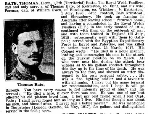 UK, De Ruvigny’s Roll of Honour, 1914-1924 about Thomas Bate. – Name: Thomas Bate – Volume 3, Page: 18 – Bate, Thomas, Lieut., 1/5th (Territorial) Battn. The Royal Welsh Fusiliers, 2nd and only surv. s/o Thomas Bate, of Kelsterton, co. Flint, and his wife, Perenna, dau. of William Owen, of Blessington, co. Wicklow; b. Kelsterton, 1 July 1890; educ. Fonthill, East Grinstead, and Shrewsbury. He took up farming in Australia after leaving School; returning home and having a commission in the Royal Welsh Fusiliers (T.F.) in the early months of 1914, continued with them on the outbreak of war, and with them trained in England till July, 1915; subsequently went with them to Gallipoli; served with the Egyptian Expeditionary Force in Egypt and Palestine, and was killed in action near Gaza 26th March 1917. His Colonel wrote: “He died in a noble manner, leading and encouraging his men in the attack on the Turkish Position on 26 March. All who were near him during the attack bear witness as to his gallant conduct thoughout this day up to the time of his death. He was always to the fore, and showed an utter disregard to his own personal safety….. He was a fine fighting soldier and a favourite with all ranks. I have put his name forward for recommendation, and I hope it will go through. You have every reason to feel intensely proud of him,” and his servant: “He died a hero, if ever there was one. He was one of our best officers; his old platoon loved him. I lost my best friend when I lost Capt. Bate; I shall never forget him as long as I live. His first thought was about his men, and himself after. I never had a better master.” He was mentioned in Despatches (London Gazette, 22 may, 1917), for gallant and distinquished service in the field; unm.
