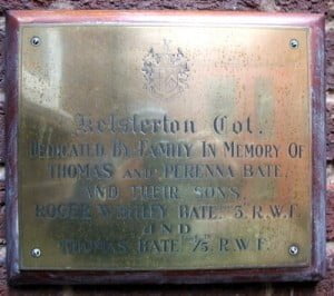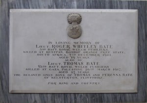 In Loving Memory of Lieut. Roger Whitley BATE 3rd Batt. Royal Welch Fusiliers Killed at Rustpan, Boshof, Orange Free State, South Africa 7th December 1901 aged 19 years. Also of Thomas BATE 1/5th Batt. Royal Welsh Fusiliers Killed at Gaza, Palestine 26th March 1917 age 27 years. The Beloved only Sons of Thomas & Perenna BATE of Kelsterton, Flintshire. “For King and Country”
