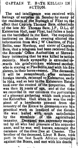 Post script. Gwendoline Mary Owen Bates, sister to Thomas, married John William Charlton and they lived in Plas Bellin Northop. Their son Major John Roger Owen Charlton MC was killed in WW2 and is buried in what is now Libya.