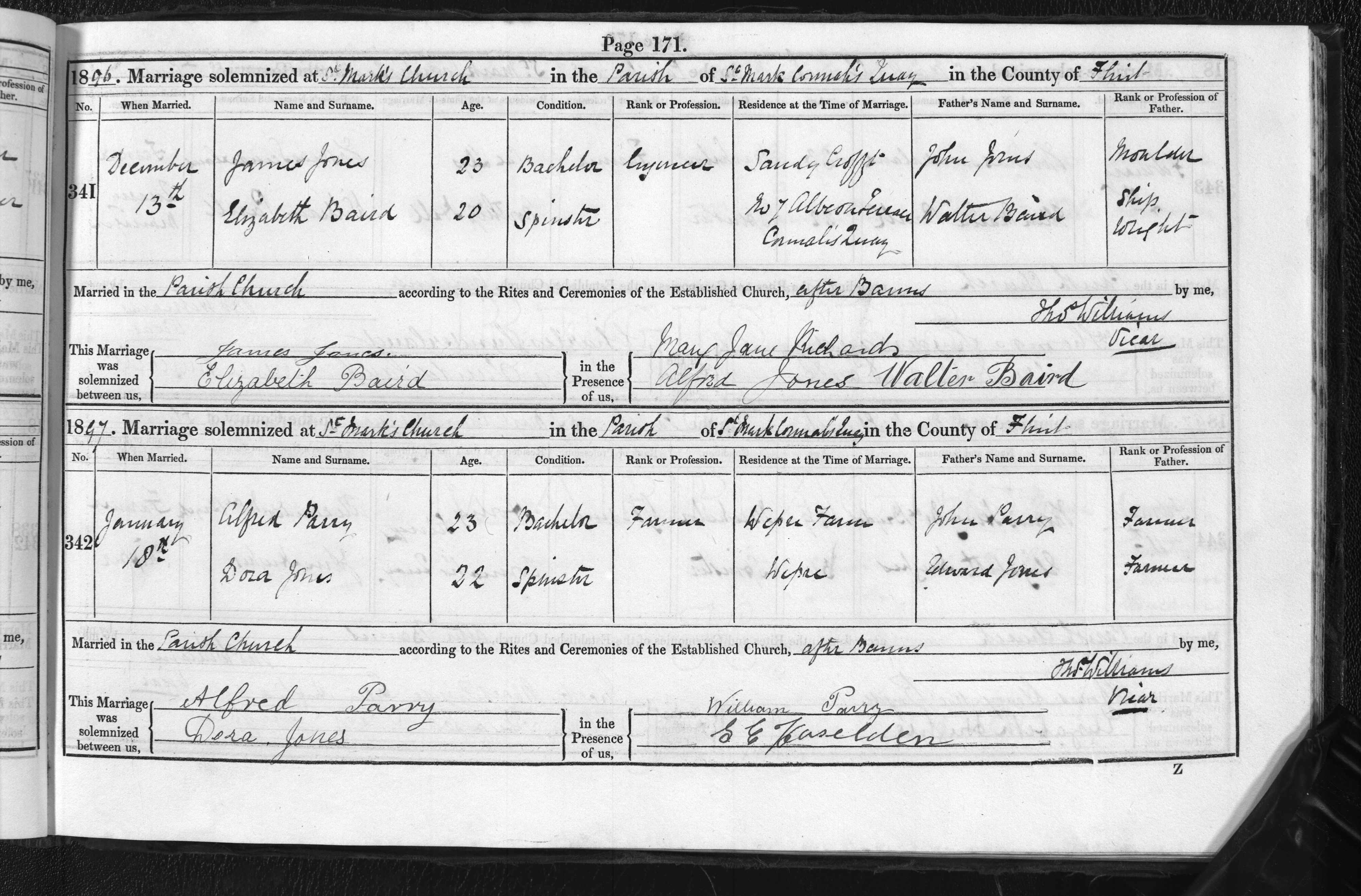Page 42 No 83 15th December 1941 William PARRY, 26, Bachelor, Sergeant R.A.F., The Island, Connah’s Quay, Alfred PARRY, Farmer & Laura WILLIAMS, 22, Spinster, 3, Cestrian Street, Connah’s Quay, John WILLIAMS (dec), Ship’s Carpenter. (After Banns)