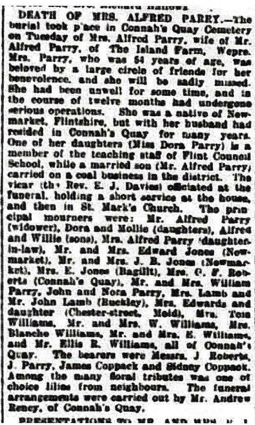 Dora (Zephorah), a native of Newmarket in her obituary/funeral in 1931, gives a lot of clues to the family, but in the time old ways of long ago, she is referred to as Mrs Alfred Parry, whereas I was hoping that this would settle it all for good, as on a death certificate of the same year there is a Zephorah Parry who died in the area, possibly at a Chester hospital:-
