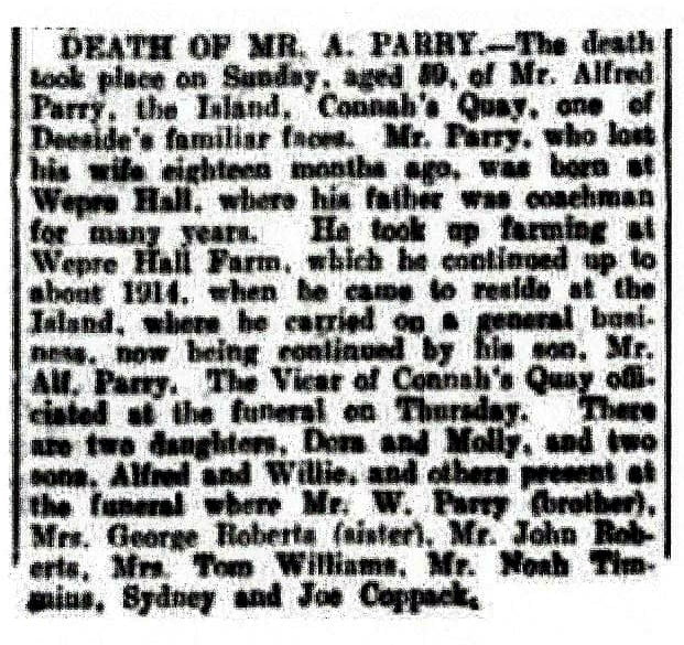 Sadly Alfred Parry, senior died 18 months later, and his funeral is in a newspaper cutting, below. So, before William left Hawarden Grammar School and went off to college, he had lost both parents.