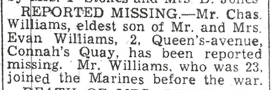 Reported Missing – Mr. Chas. WILLIAMS, Eldest son of Mr.& Mrs. Evan WILLIAMS, 2, Queen’s-avenue, Connah’s Quay, has been reported missing. Mr. WILLIAMS, who was 23, joined the Marines before the war.
