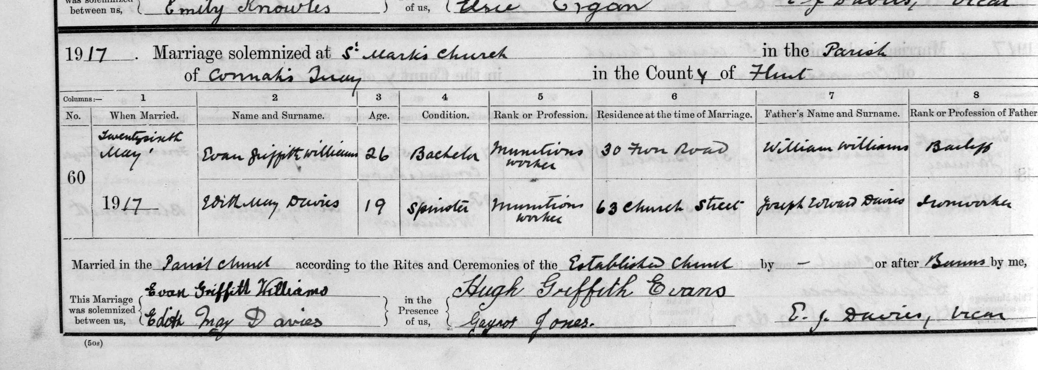 Page 30 No 60 26th May 1917 Evan Griffith WILLIAMS, 26, Bachelor, Munitions Worker, 30, Fron Road, William WILLIAMS, Bailiff & Edith May DAVIES, 19, Spinster, Munitions Worker, 68, Church St., Joseph Edward DAVIES, Ironworker. (After Banns) Witnesses: – Hugh Griffith EVANS & Gaynor JONES.