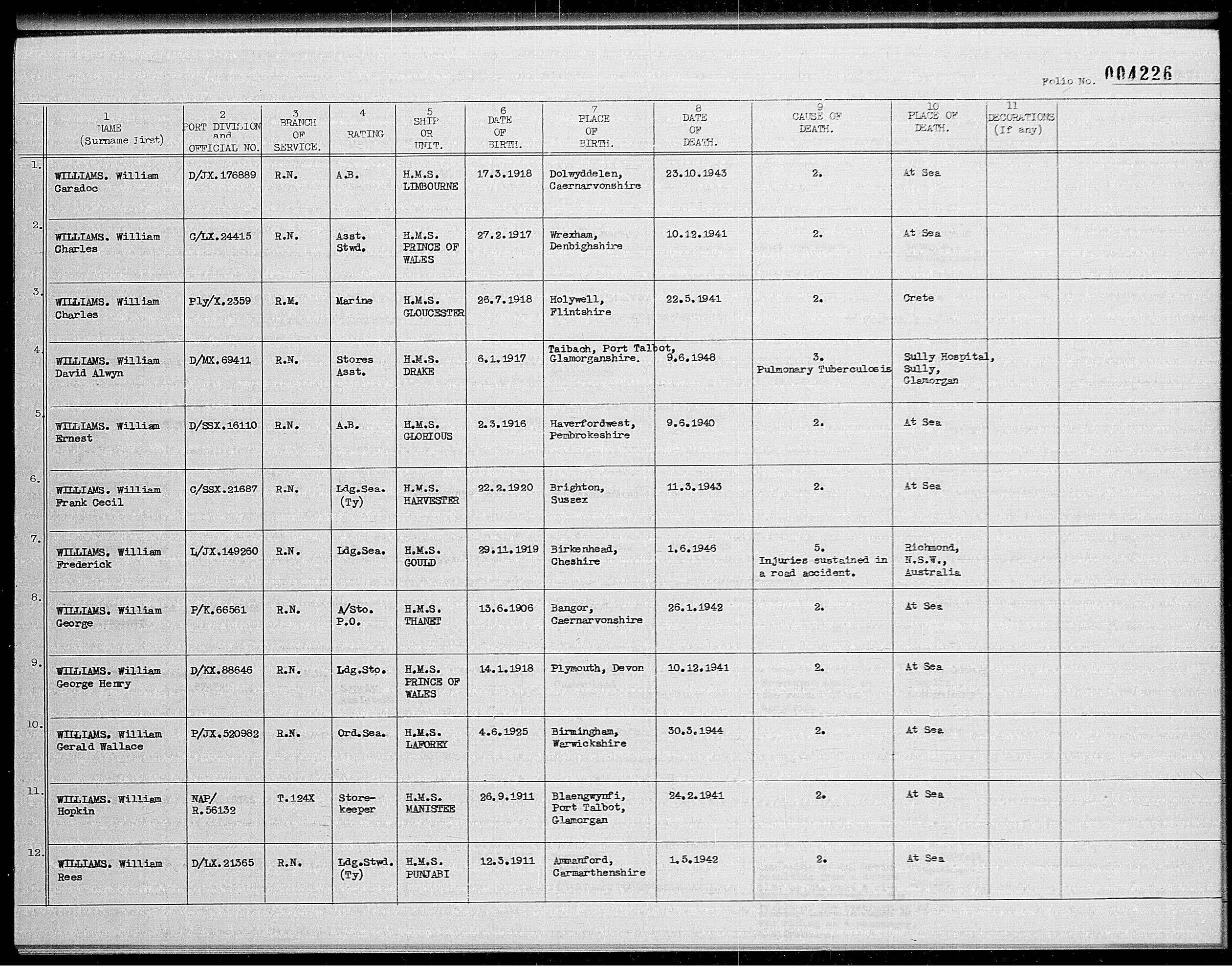 According to the Registers of Reports of Deaths Naval Ratings (Below), William Charles was to have died in Crete. However, the cause of death was “2” – Missing, Death in War Service Presumed. His CWGC Citation has his age as 20, but he was 23 years old.