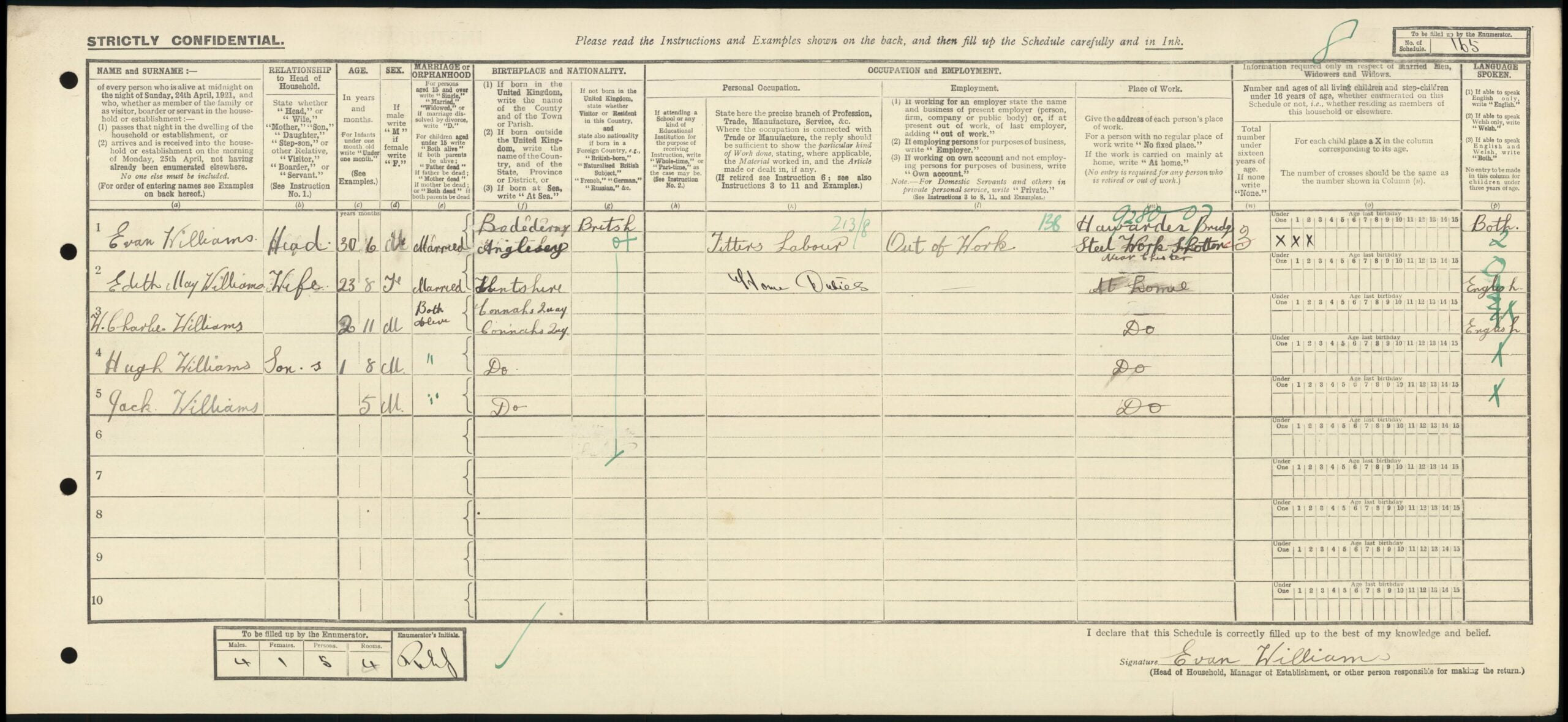 The 1921 census, which was taken on the 19th of June 1921, gives us a glimpse of the family, now living at 33, Lower Brook Street, Connah’s Quay. Evan Williams was head of the household and was now 30 years 6 months old and had been born at Bodedern, Anglesey, he was a Fitter’s Labourer at Hawarden Bridge Steelworks, but was out of work. Edith May Williams was now 23 years and 8 months old; she had been born in Flintshire and doing “Home Duties.” Their children were W. Charles William who was 2 years and 11 months old. Hugh Williams was 1 year and 8 months old and Jack Williams was 5 months old, all had been born in Connah’s Quay