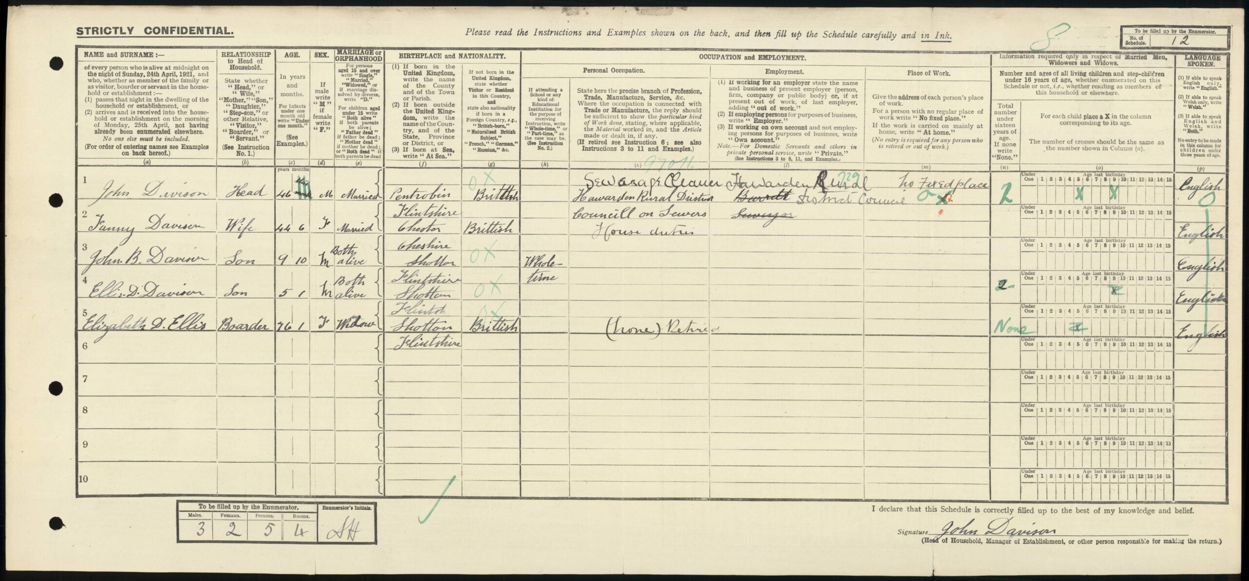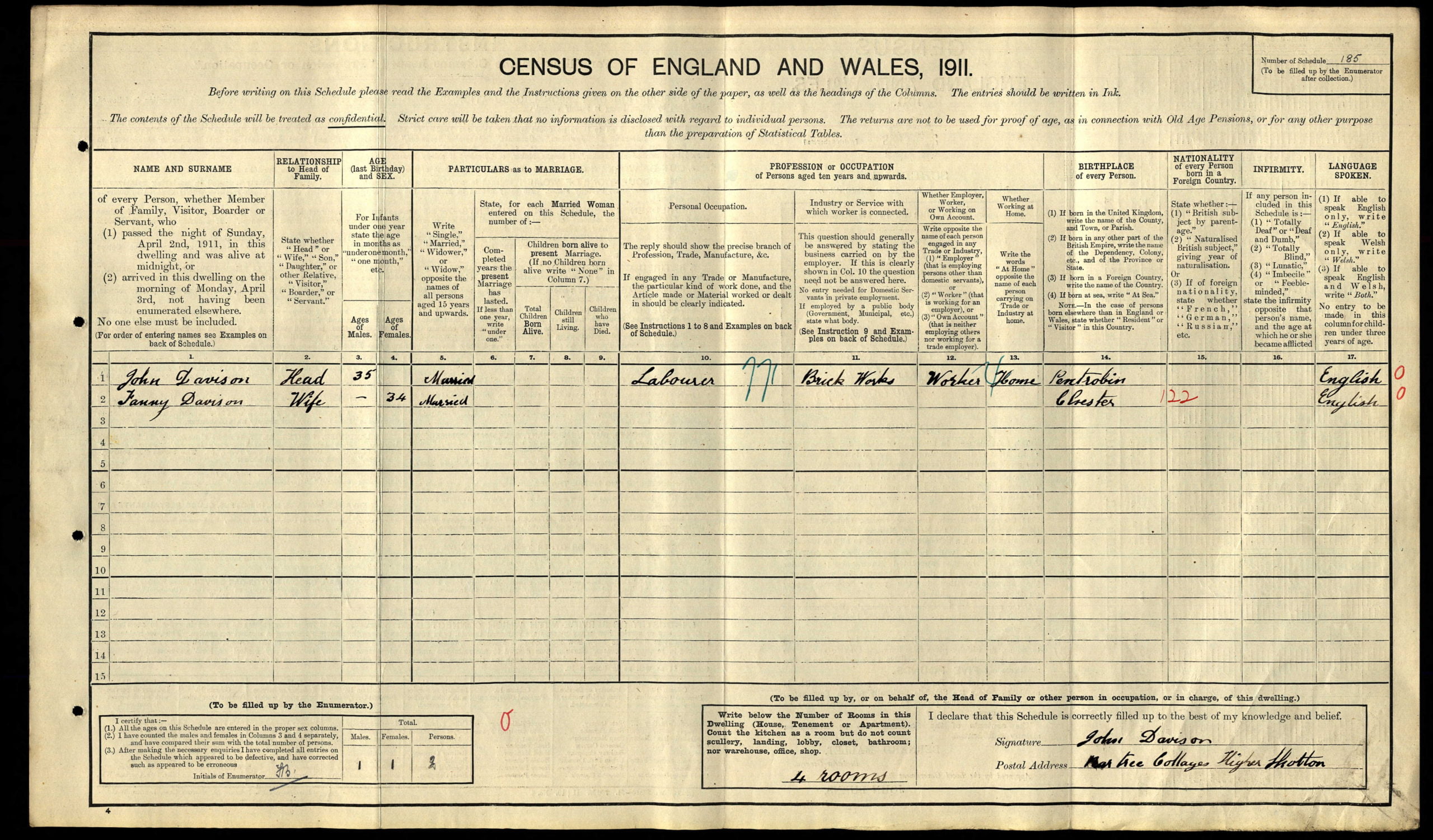 They were living at Pear Tree Cottages, Higher Shotton, Queensferry, Flintshire, (4 rooms). John Davison, 35 and married was a Labourer in the Brick Works and had been born in Pentrobin, Hawarden, Flintshire. Fanny Davison was 34 and had been born in Chester.