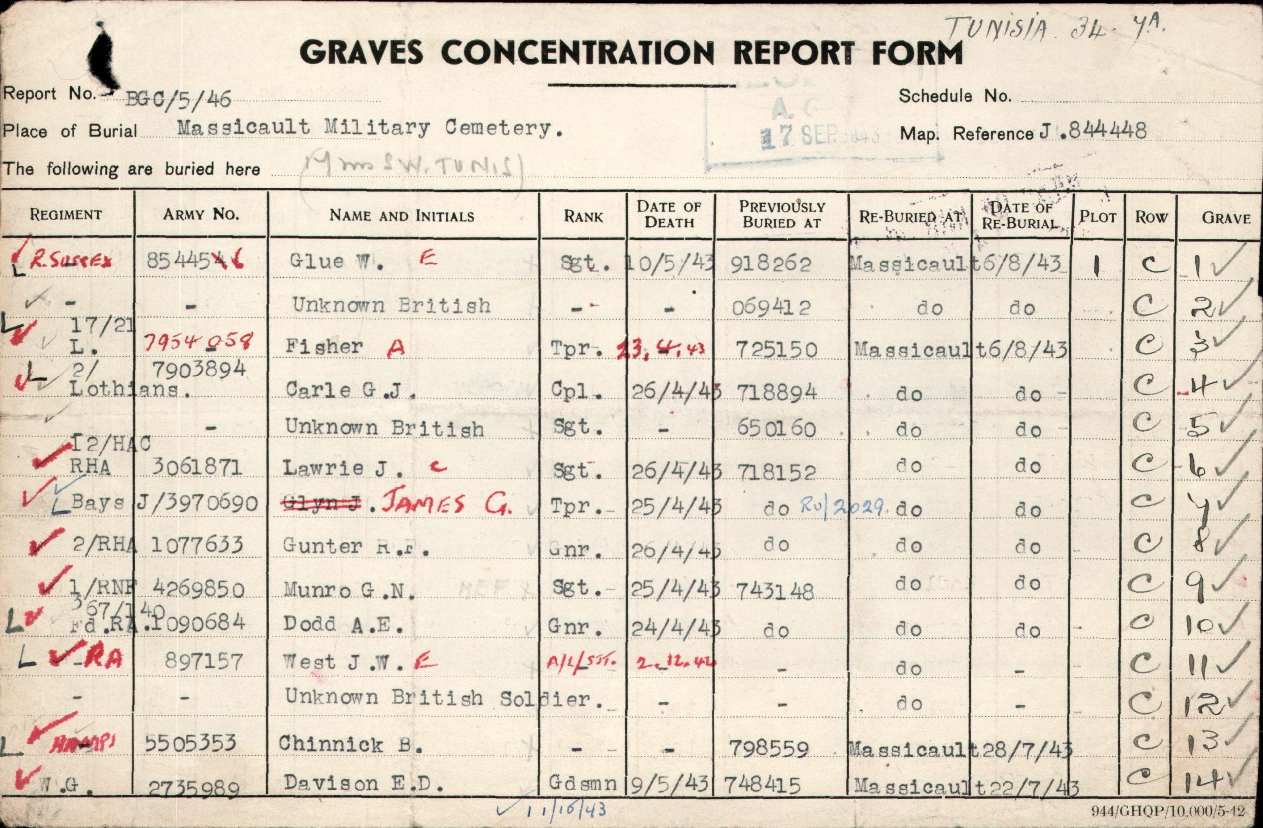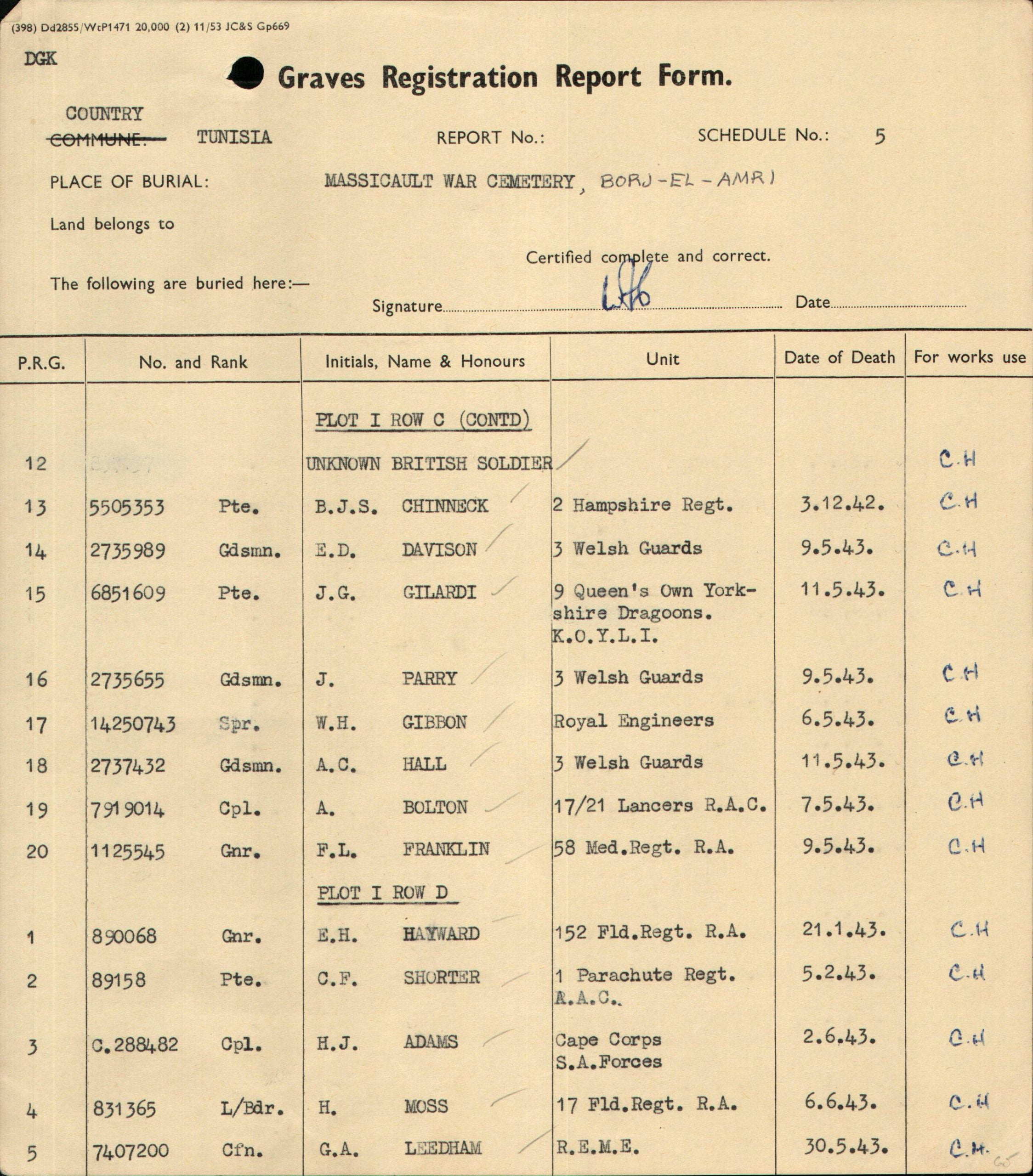 The Commonwealth War Graves Commission Graves Concentration Report Form tells us that he was buried, probably near where he died at 748415 (I do not know where that is) and then reburied on the 22nd July 1943, not long afterwards, at Massicault. He was buried a few graves away (Plot I.C. 16.) from another 3rd Bn. Welsh Guardsman, 2735655, J. Parry, who died at the same place as Ellis.