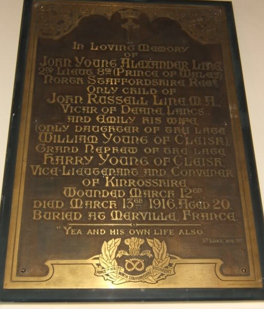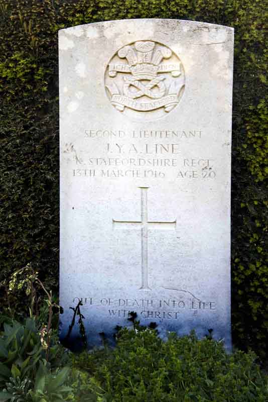 “We have to mourn the loss of 2nd Lieut. J Y A Line, 8th Bn. N Staffs Regt. He was hit by a sniper on March 12th last while superintending the draining of a trench, and died of wounds the next day. Lieut. Line was the only child of an old and very keen Downing man, the Rev J R Line, MA, Vicar of Deane, Bolton, Lancs. He came up from Oundle School in October 1914, with an Exhibition gained for History, with a view to studying Law. He was a keen Rugby Footballer but joined also, with exemplary zest, in that very important though now almost forgotten sport, the College Rowing. Towards the end of his first term Mr Line gained a Commission in the N Staffs Regt. He was sent to the front on Christmas Eve 1915, and met his death three months later after having gained high praise from his superior Officers and admiration from his subordinates. Those of us who have known him will respect his memory, and sympathise with his sadly bereaved parents”.