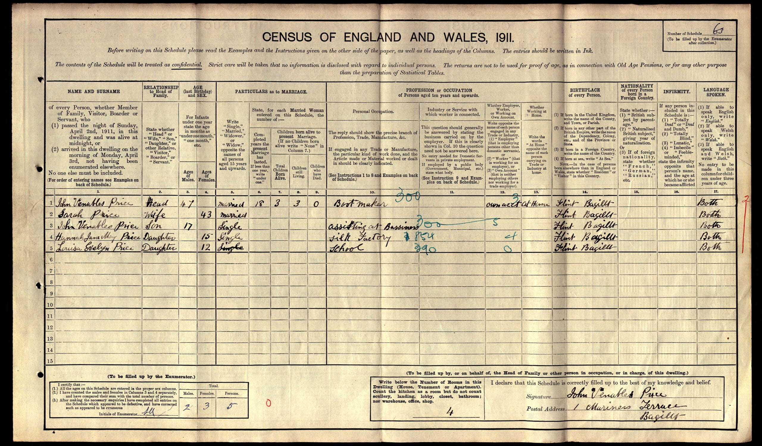 John Venables Price is seen on the 1911 census living at 1,k Mariners Terrace, Bagillt, with his family. Head of the household was his father, also John Venables Price, was 47 years of age and a Boot Maker, working on his own account at home. His mother, Sarah Price, 43 tell us that they had been married for 18 years and 3 children had been born to them, all still living. The three children were John Venables Price, 17, single and “Assisting at Business,” Hannah Jane May Price, 15, single and working at the Silk Factory and Louisa Evelyn Price, 12, at School. The whole family had been born in Bagillt, Flintshire. The family were bilingual.