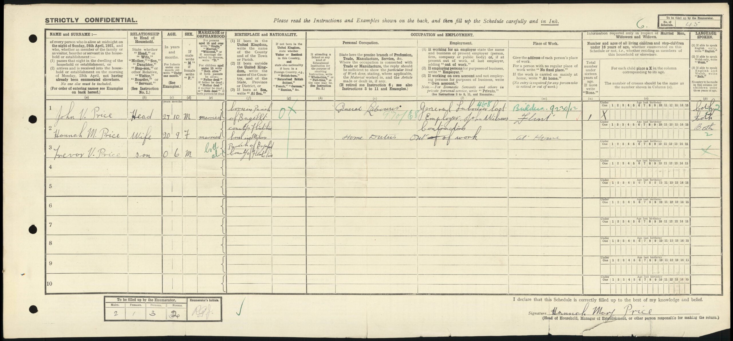 Trevor Venables Price is seen for the first time on the 1921 census which was taken on the night of the 19th June 1921. They are living at Penllongley Cottages, Holywell, Flintshire. John V. Price was 27 and 10 months old, Married and had been employed by John Wilson’s Contractors but was noe “Out of Work.” He had been born in the Parish of Bagillt. Hannah Mary Price, was 20 years and 9 months old, and had been born in Milwr, Parish of Brynford. Trevor Venables Price was 6 months old and had also been born in the Parish of Brynford, County of Flintshire.