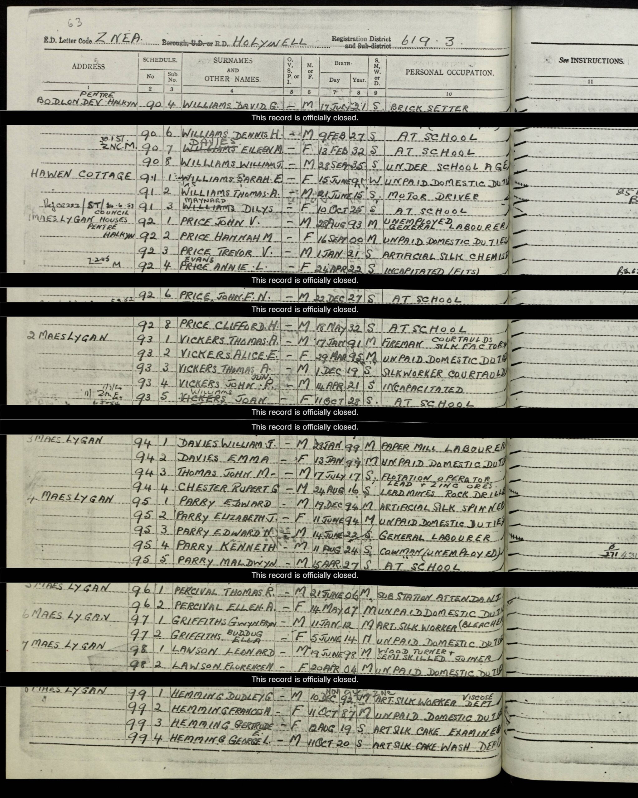 The next time we see Trevor is on the 1939 National Register, which was taken on the 29th September 1939, this shows the family living at Maes Lygan Council Houses, Pentre Halkyn. This source gives us dates of birth as well as other information. John V. Price had been born on the 28th August 1893 and he was an Unemployed General Labourer. His wife Hannah M. Price had been born on the 16th September 1900 and was a married woman, but as she had no job, was described as doing “Unpaid Domestic Duties.” Trevor V. Price, who was single, had been born on the 1st January 1921 and was an Artificial Silk Chemist. John F.N. Price had been born on the 22nd December 1927 and was “At School.” Annie L. Price* had been born on the 24th April 1922 and was sadly “Incapacitated (Fits).” Clifford H. Price had been born on the 18th May 1932 and was “At School.” There were two other entries but they had been redacted or were officially closed, so I do think they may have been other siblings**.