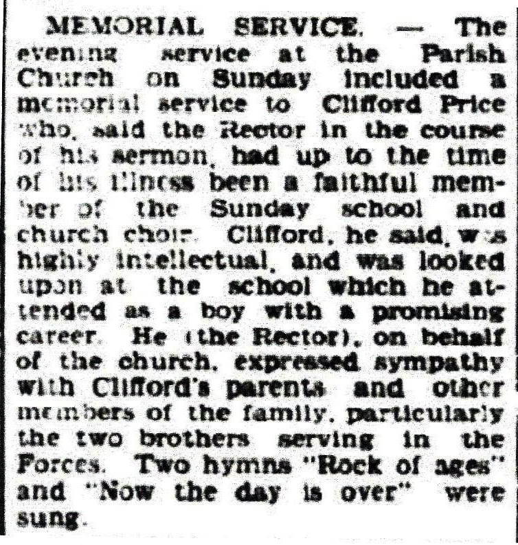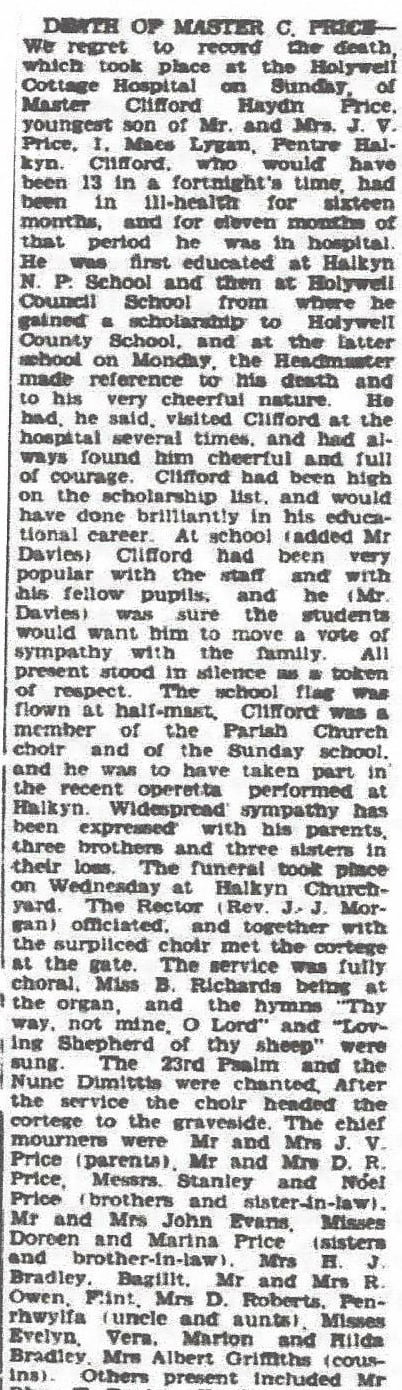 Tragedy was to hit the family again, when on possible Sunday the 29th April, 1945, the youngest member of the Price family, Clifford Hayden Price, was to succumb to an illness of 16 months and died in Holywell Cottage Hospital just 2 weeks short of his 13th birthday, below are some newspaper cuttings of his funeral and his Memorial Service. (Dated the 4th May and the 25th May 1945, both Flintshire County Herald). Clifford had gained a scholarship to Holywell County School and his Headmaster made reference to his death and to his very cheerful nature. He had found him cheerful and full of courage and was well liked by the Staff and pupils alike. The school flag was flown at half-mast. Widespread sympathy was expressed for his parents.
