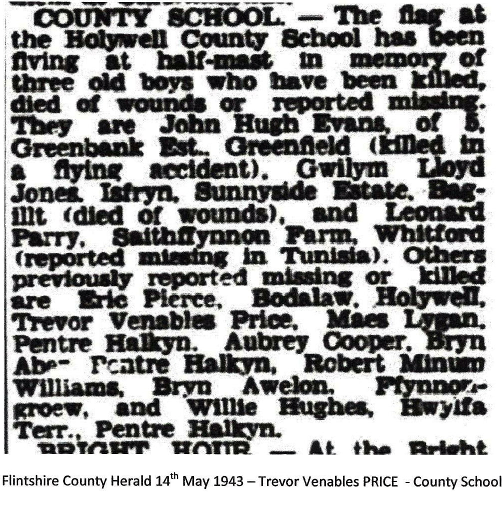 There is a newspaper cutting from the Flintshire County Herald dated the 14th May 1943 when the County School lowered the Flag to half-mast in memory of three old boys who had been killed or died of wounds or reported missing, it also mentioned others, who may have suffered the same fate, including Trevor.
