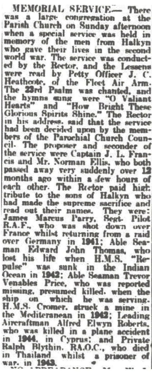 John Venables and Hannah Mary Price were alive to participate in a Memorial Service for the men from Halkyn who gave their lives in the second world war, including of course their son Trevor, but they made sure that Trevor would be remembered for perpetuity by adding his name to the others who had fallen from the village. The newspaper cutting, Flintshire County Herald, dated the 4th January 1946, below, gives more details, but remember that they had only just buried their youngest son 7 months before, so this must have been very hard .