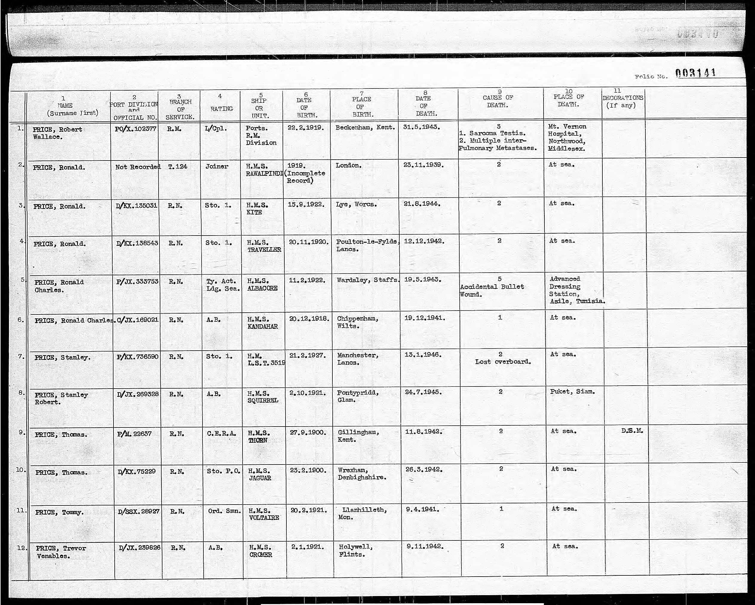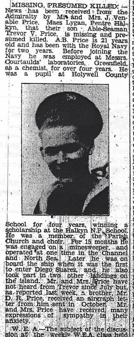 - PRICE, TREVOR VENABLES (21), Able Seaman (no. D/JX 239826), HMS Cromer, Royal Navy, †09/11/1942, Son of John Venables Price and Hannah Mary Price, of Pentre Halkyn, Flintshire, Memorial: Plymouth Naval Memorial Read more at wrecksite.