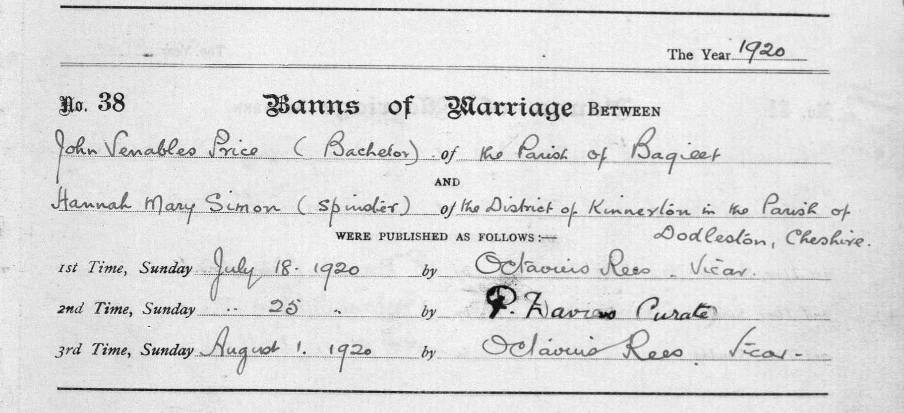 Trevor Venables was the son of John Venables & Hannah Mary Price (nee Simon) who had his Banns read at Bagillt at St. Mary’s Church. Hannah Mary Simon probably had her Banns read at her church at Dodleston, Cheshire. Their Banns were read between the 10th July and the 1st August 1920, but I cannot find a copy of their marriage certificate, so I don’t know the exact date.