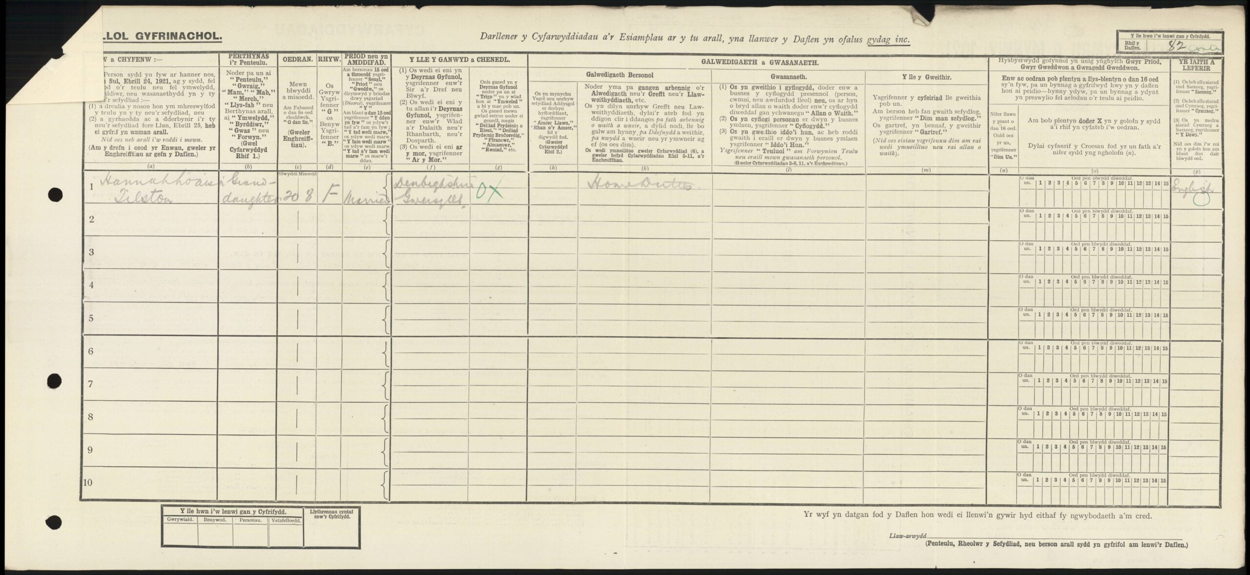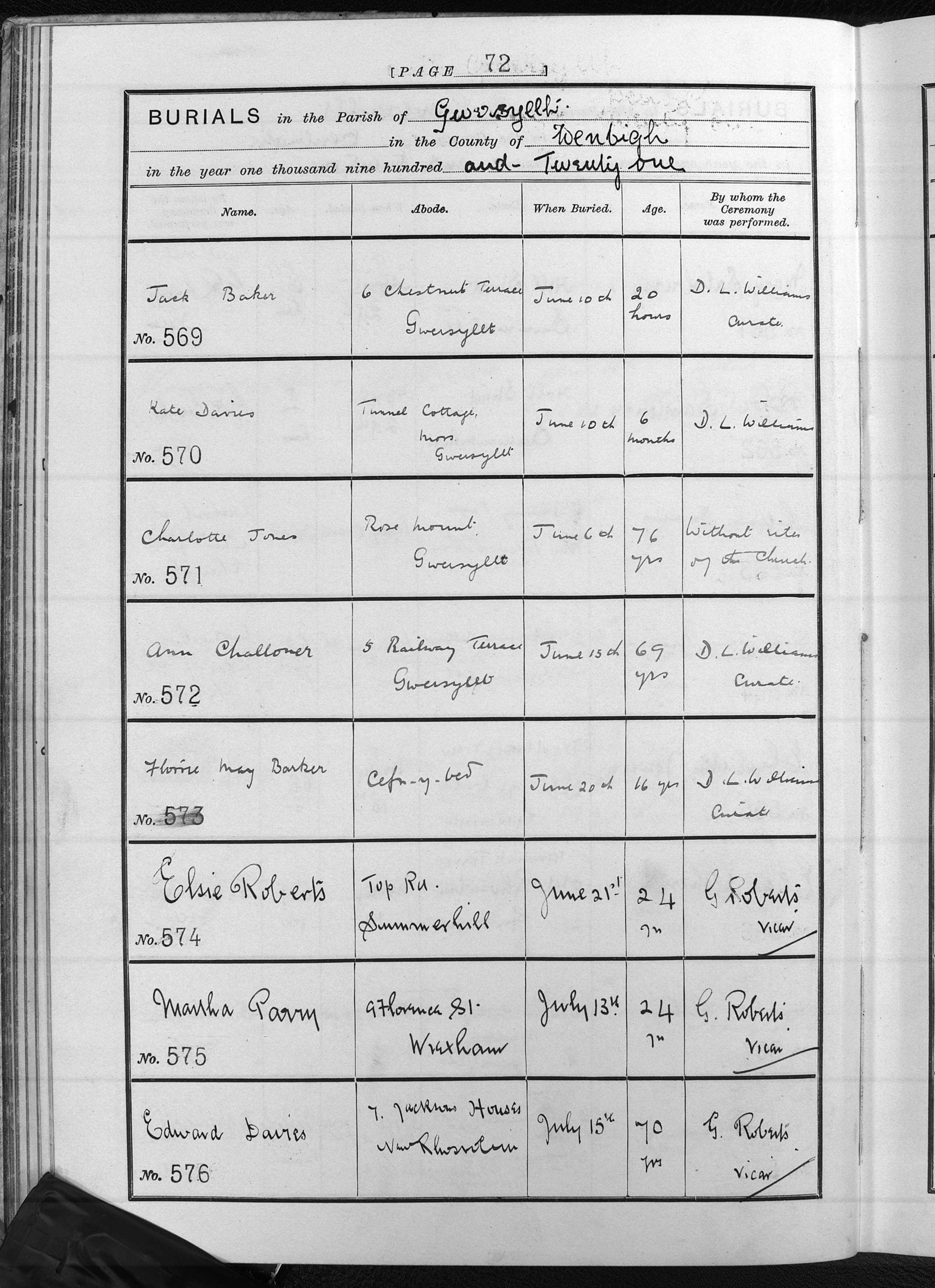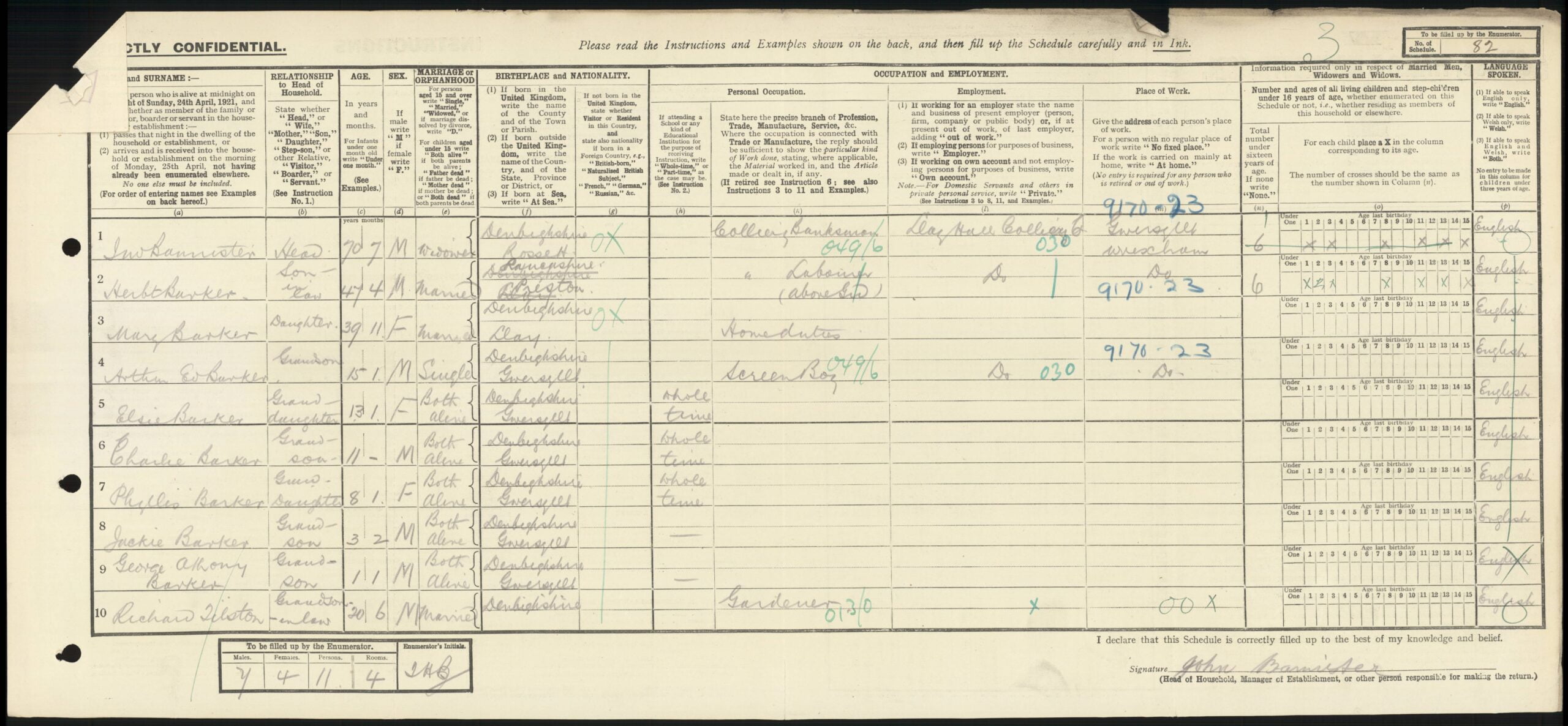 We see the family on the 1921 census, which was taken on the 19th of June 1921, living at 3, Alyndale Terrace, Cefn-y-bedd, still with John Bannister, head of the household, he was now 70 years and 7 months old, a widower and Colliery Banksman at Llay Hall Colliery Gwersyllt, Wrexham. Herbert Barker, his son-in-Law was 47 years and 4 months old and a Colliery Labourer at the same Colliery. Mary Barker, John Bannister’s daughter was 39 years and 11 months old, born in Llay, Denbighshire. Their children were Arthur Ed. Barker, 15 years and 1 month old, single and a Screen Boy at the above Colliery. Elsie Barker, 13 years and 1 month old, Charlei Barker, 11 years old, Phyllis Barker 8 years and 1 month old, Jackie Barker 3 years and 2 months old, George Anthony Barker 1 year and 1 month old, they had all been born in Gwersyllt, Denbighshire. Their daughter had married and was on the census with her husband, Richard Tilston, 20 years and 6 months old, born in Denbighshire and Hannah Louisa Tilston, 20 years and 8 months old, doing ‘Home Duties,’ She had also been born in Gwersyllt and at the same address as her parents and grandfather. They had married in the June quarter of 1921.
