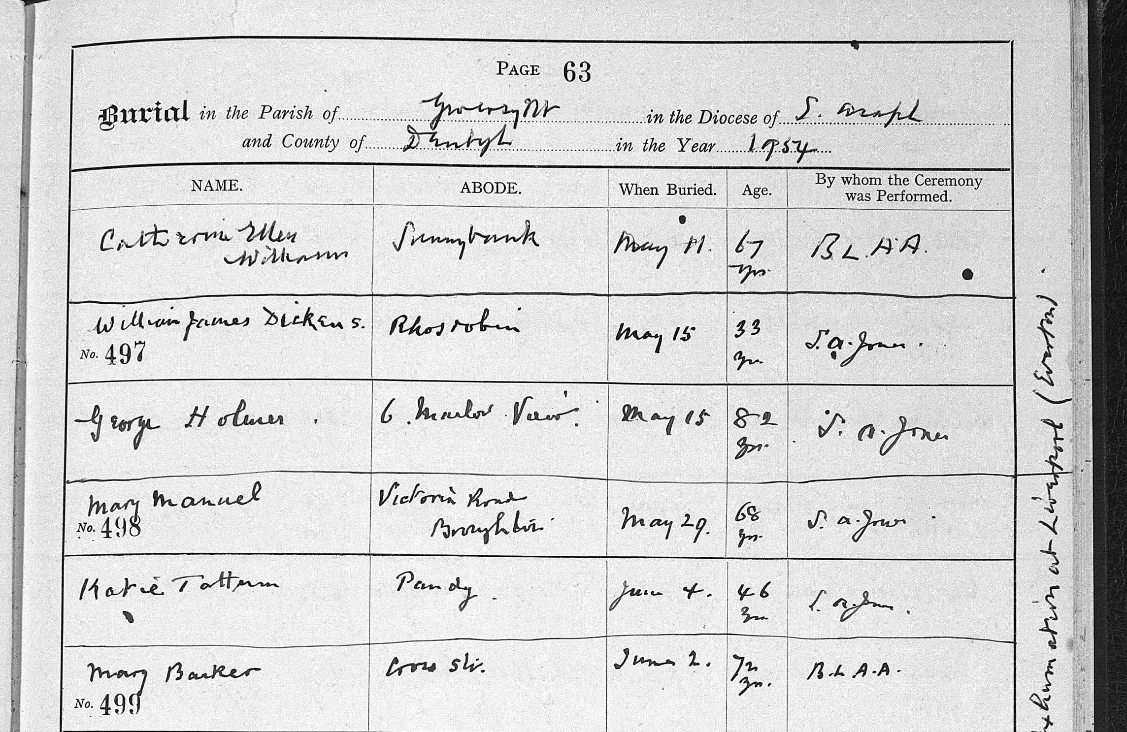 In 1939, on the 29th of September, a National Register was taken and I believe that Herbert & Mary were living at 3 Alendale Terrace , Wrexham, Denbighshire. This source tell us the date of birth of birth and occupation etc. Herbert Barker had been born on the 2nd of February 1874 and was a Coal Miner Retired (Hewer), his wife Mary had been born on the 5th of July 1881and as most women on this register who did not have a job was described as doing “Unpaid Domestic .” A George A. Barker had been born on the 19th of May 1920 and was single and a Brickworks Labourer, Heavy Worker. Also in the household, was James Conlin, he had been born on the 24th of December 1931 and was “At School.”