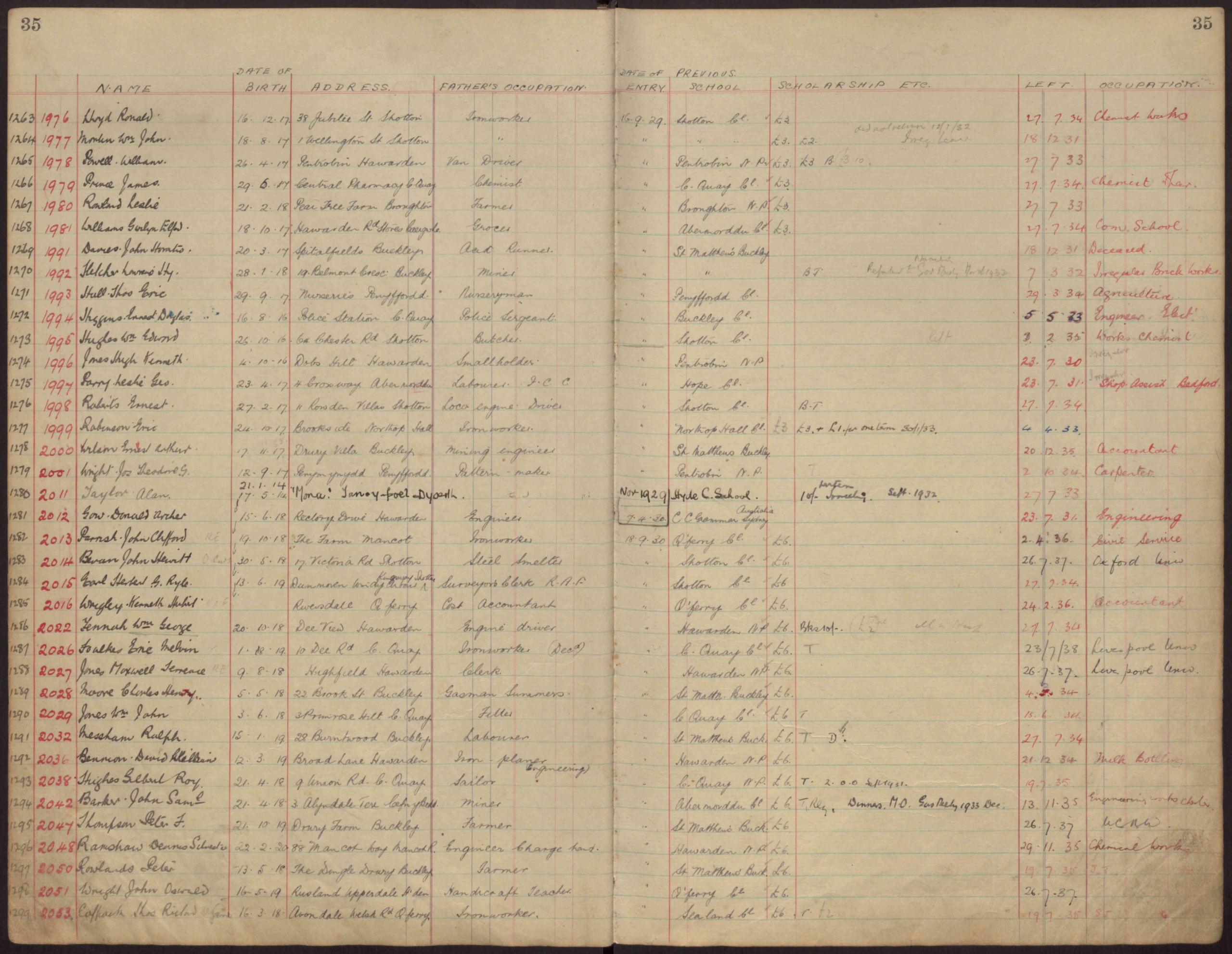 1294/2042 BARKER, John Samuel born 21st April 1918. 3, Alyndale Terr., Cefn y bedd. Father – Miner, Former School, Abermorddu Council. Scholarship – £6. T. Reg., Dinnas (or Dinners?) M.O., Gas Meely? 1933. Date of leaving – 13th November 1935 – Engineering Works, Chester.