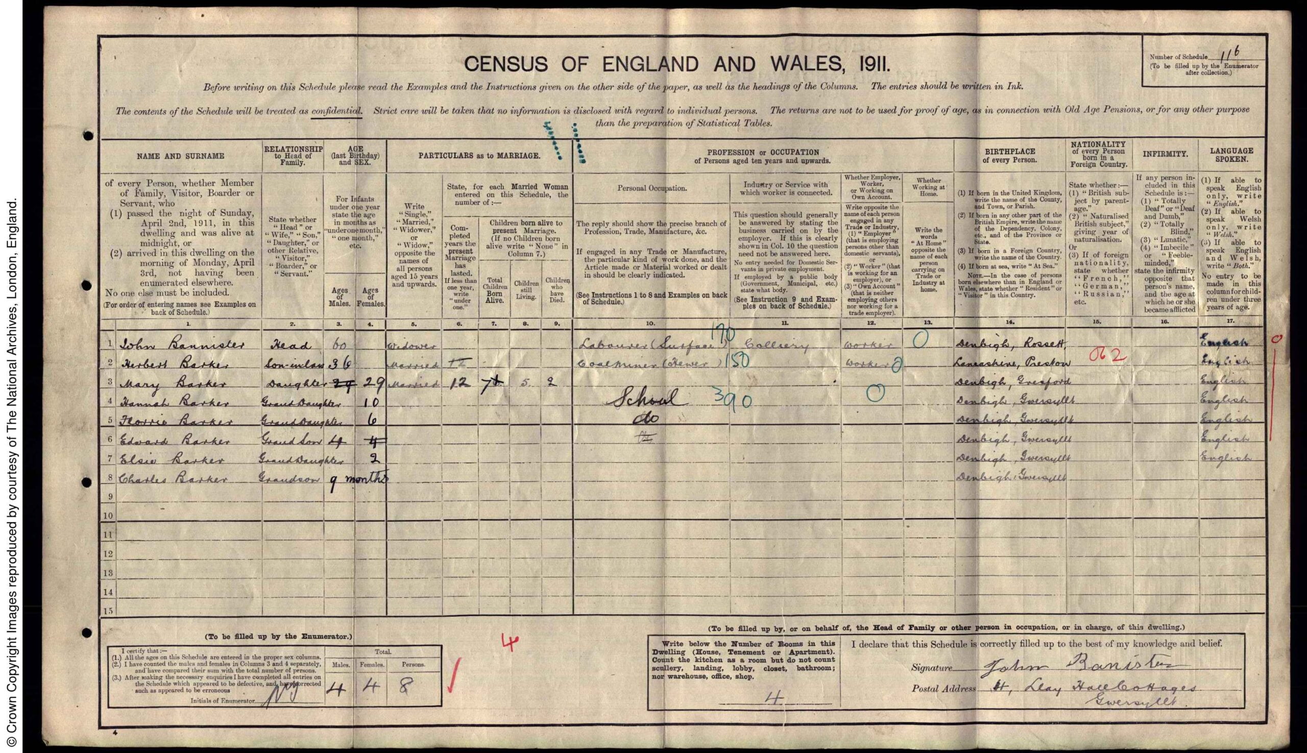 By 1911 they were still living at Llay Hall, but at 4, Llay Hall Cottages, the head of the household was Mary’s father John Bannister age 60 and a widower, he was a Labourer (Surface) and had been born in Rossett, Denbighshire. Herbert Barker, 36 was his son-in-law tell us that he had been married for 12 years and was a Coal Miner and confirms his place of birth as Preston, Lancs. Mary Barker, 36 and John’s daughter, tells us that 7 children had been born and 2 had sadly died. The grandchildren of John Bannister were Hannah, 10, Florrie, 6, Edward, 4, Elsie, 2 and Charles, 9 months, they had all been born in Gwersyllt.