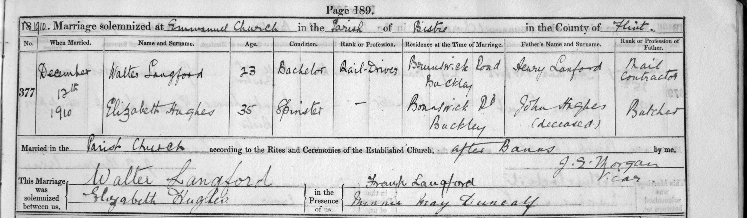 He was the son of Walter & Elizabeth Langford (nee Hughes), they had married at St. Emmanuel’s Church, Bistre on the 12th of December 1910. Walter was 23, a bachelor and Rail-Driver, his father was Henry Langford, a Mail Contractor. Elizabeth was 35 and a spinster, her father was John Hughes (Deceased) and a Butcher. Their abode was Brunswick Road, Buckley. Their witnesses were Frank Langford and Minnie May Duncalf.