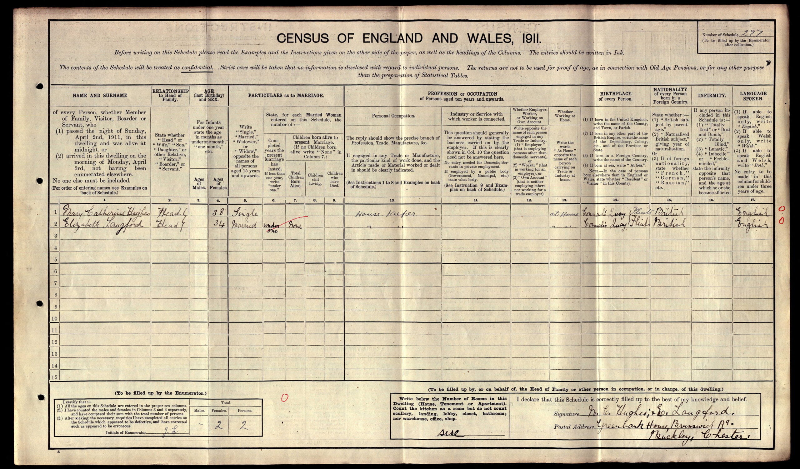 Elizabeth Langford died, I believe, in 1951 (Holywell Vol. 8a Page: 489) age 75 and Walter died, I believe, in 1955 ( Hawarden Vol. 8a Page 450) age 67 years. So they may have been able to see the Dedication on the 3rd February 1951.