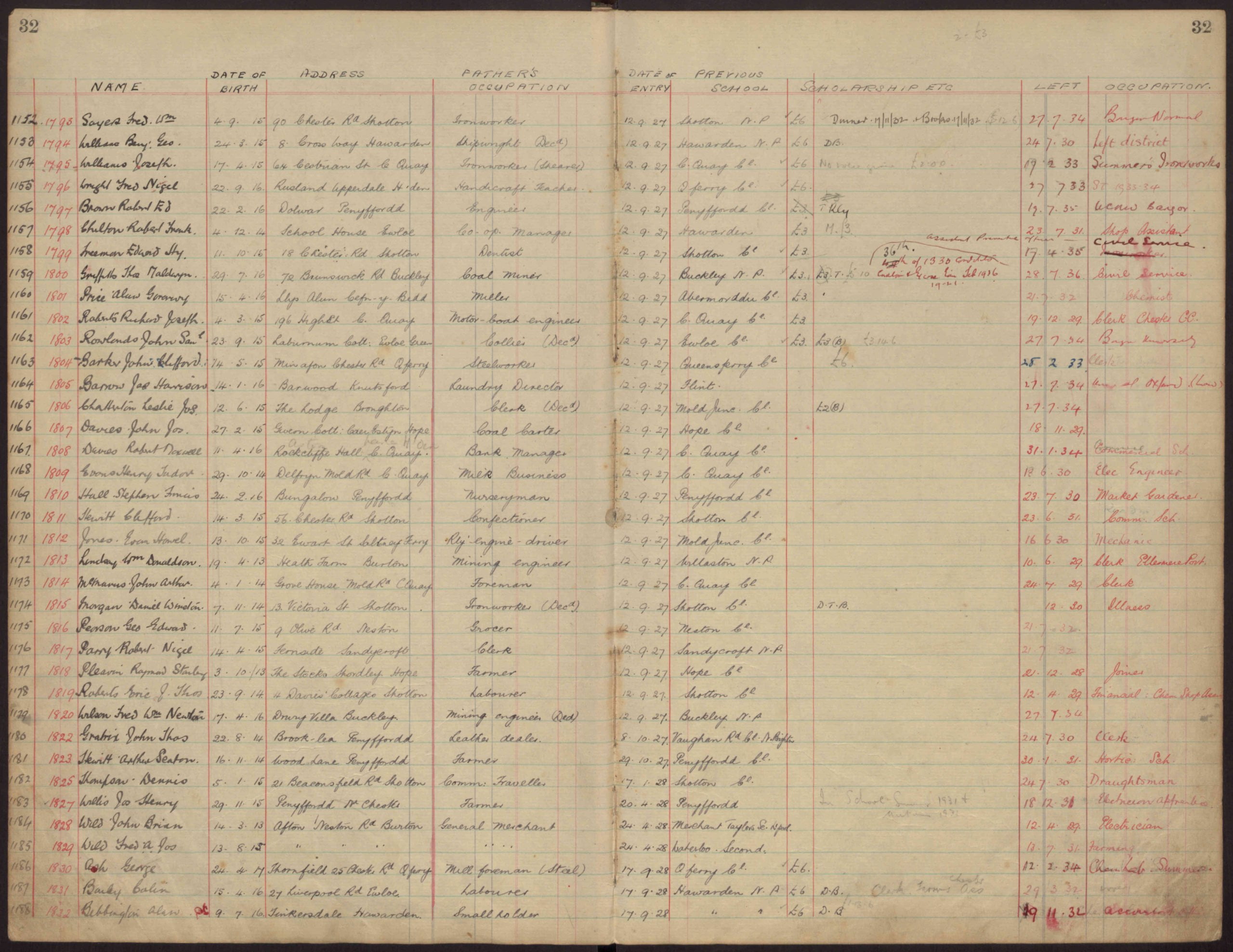 1173/1814 McMANUS, John Arthur, date of birth 4th January 1914, Grove House, Mold Road, Connah’s Quay, Father – Foreman, date of entry – 12th September 1927, Connah’ Quay Cl., date of leaving – 24th July 1929 – Clerk.