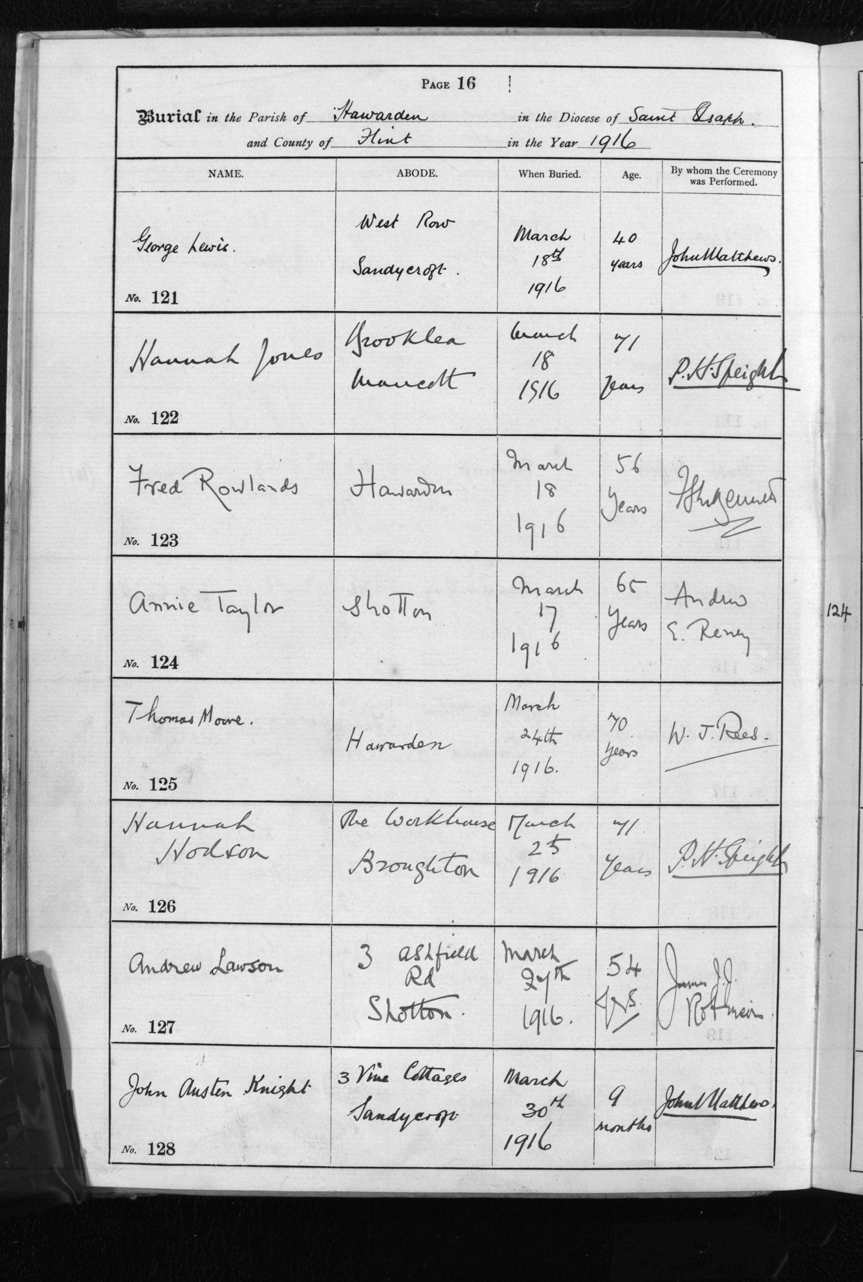 Tragedy struck in 1909 when Jane Elizabeth died, her funeral was on the 9th March and she was laid to rest in Hawarden Churchyard, she was 42 years old and Fred Forsyth was 13 years old.