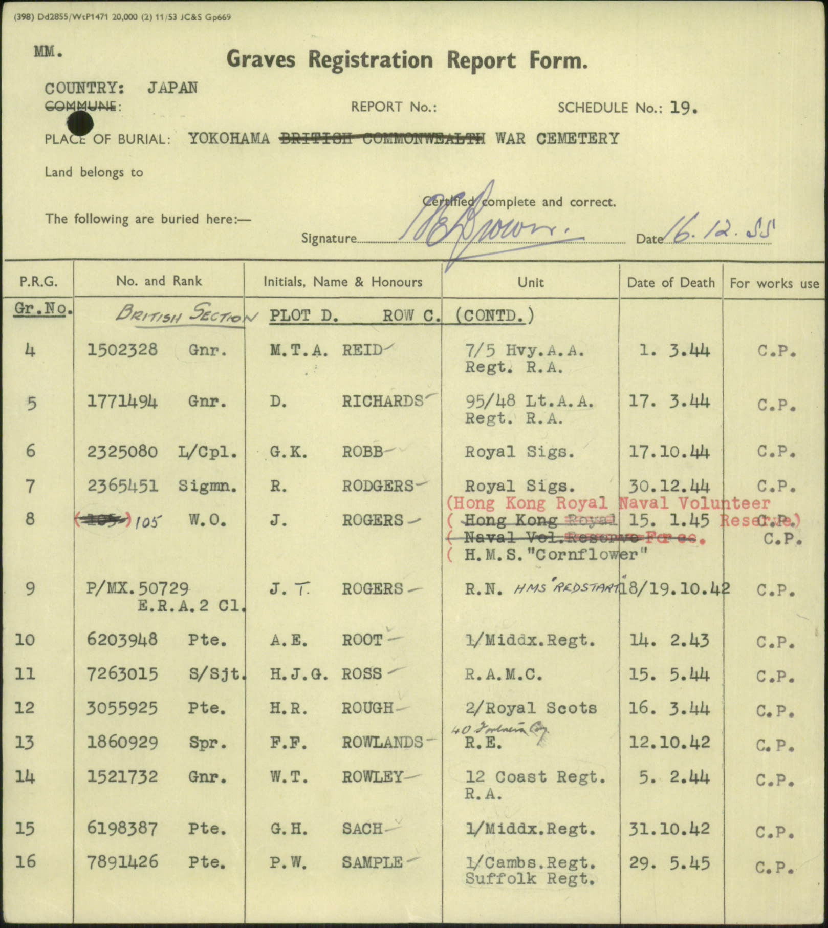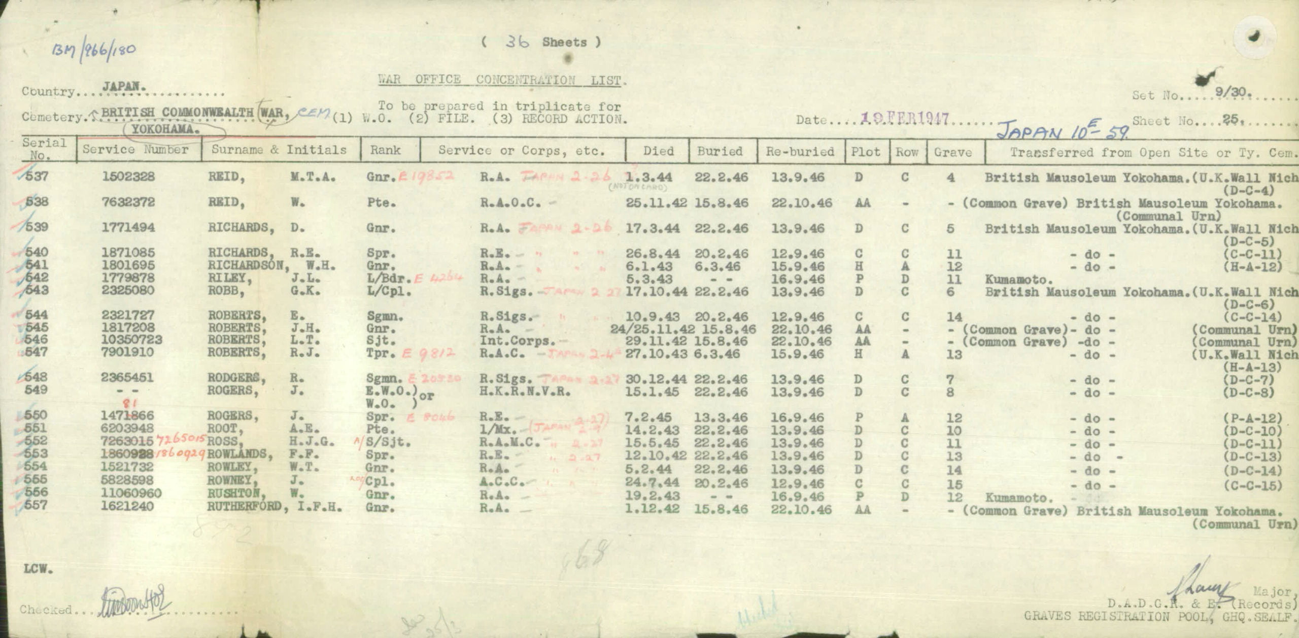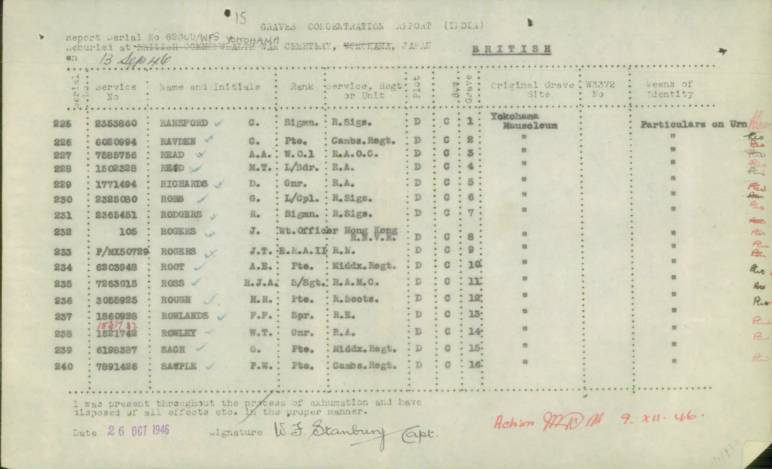 The Commonwealth War Graves Concentration Graves Report Form informs us that his ashes were initially buried at the Yokohama Mausoleum, then on the 22nd of February 1946 his Urn was buried and then on the 13th of September 1946 he was re-buried at the Yokohama War Cemetery.