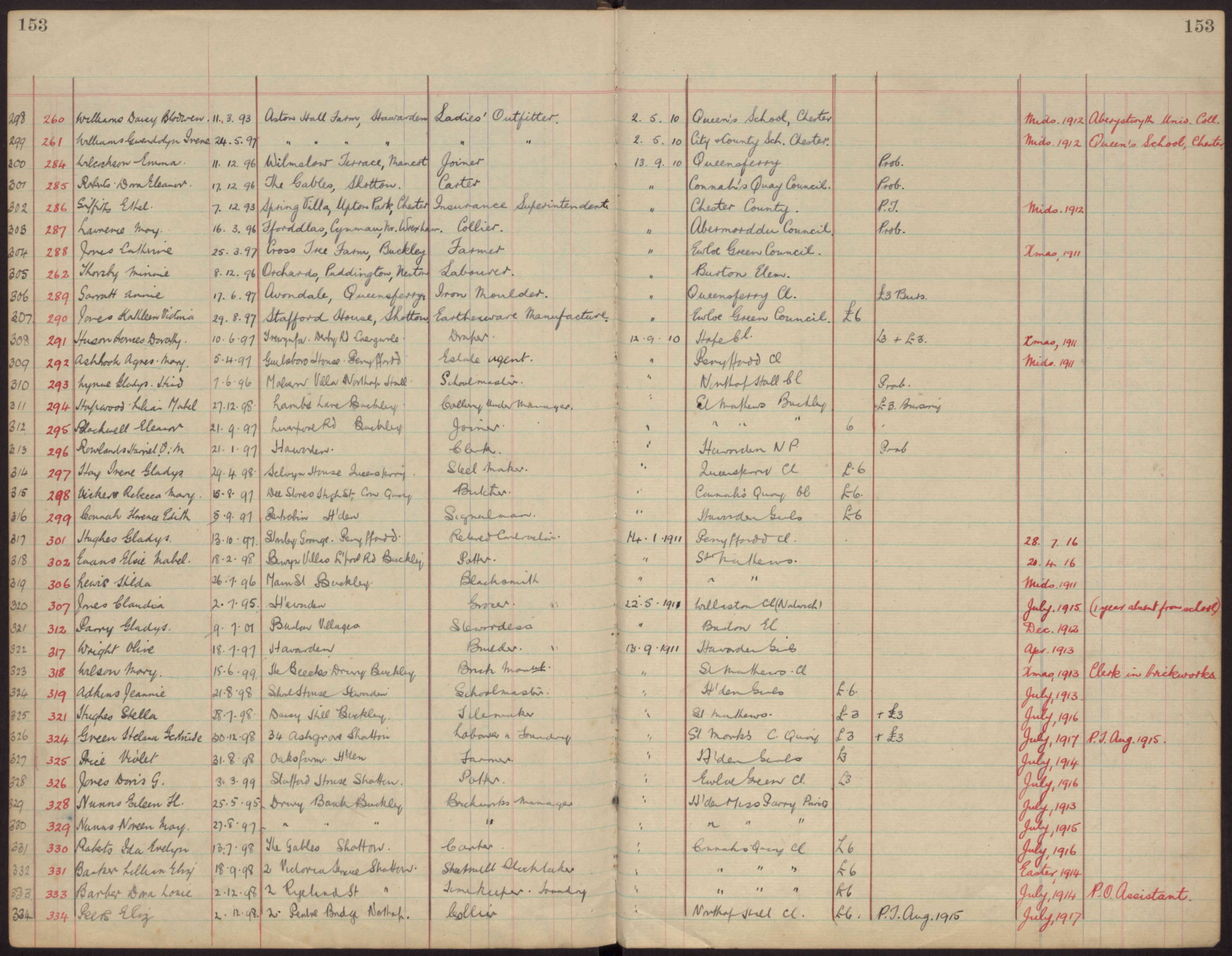 313/296 ROWLANDS, Harriet O.M. Date of birth – 21st January 1897, address – Hawarden, Father – Clerk, date of entry – 12th September 1910, previous school – Hawarden N.P., Prob. No date of leaving.