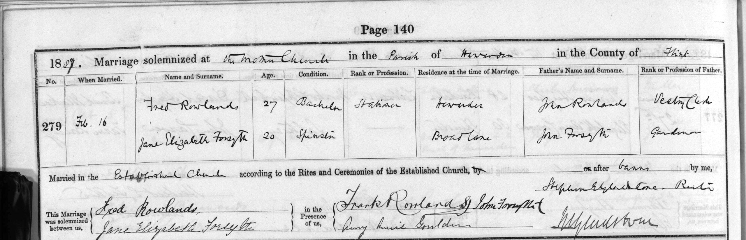 Fred Forsyth Rowlands was born on the 5th June 1895, the son of Fred & Jane Elizabeth Rowlands (nee Forsyth), who married after Banns in St. Deniol’s Church, Hawarden on the 16th February 1887. Fred Rowlands, 27 and a Bachelor was a Stationer and his abode was Hawarden. His father was John Rowlands and a Vestry Clerk. Jane Elizabeth Forsyth, 20 and a Spinster, lived in Broad Lane. Her father John Forsyth was a Gardener.