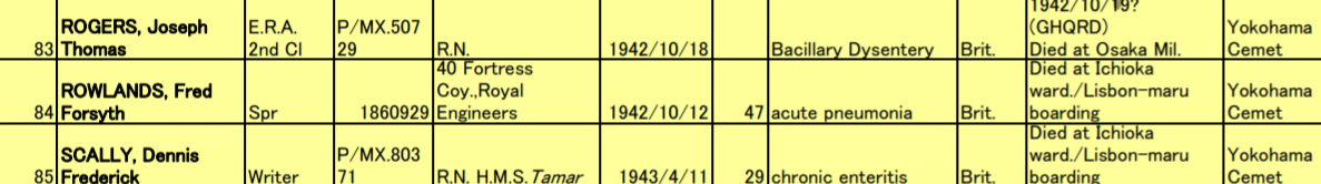 timuk (from WW2talk)tells us – Fred Rowlands was transported from Hong Kong on 27 Sept 42 on board the Lisbon Maru. The Lisbon Maru was torpedoed and sunk by USS Grouper. Fred survived and was taken to Japan. He arrived at Osaka 1 (Minato-ku) on 11 Oct 42 and died 12 Oct 42. Many thanks again to WW2talk Forum and timuk. http://www.powresearch.jp/en/pdf_e/powlist/osaka/osaka_1b_osaka_e_001.pdf
