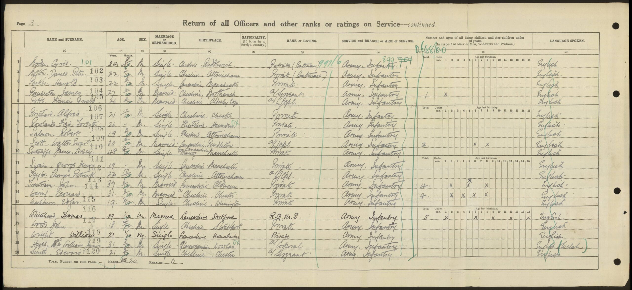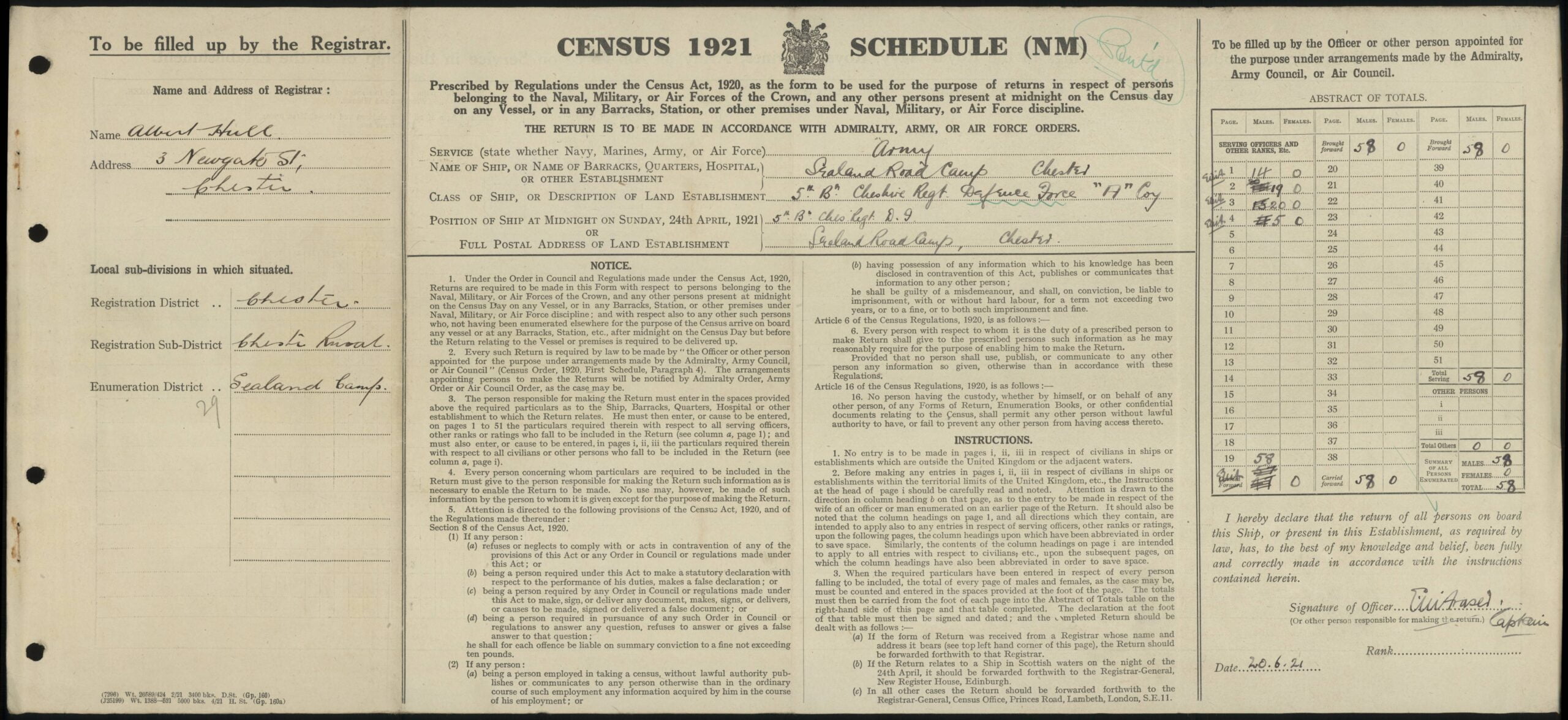 The 1921 census shows that Fred Forsyth Rowlands had enlisted into A Company, 5th Battalion, Cheshire Regiment (Defence Force), based at Sealand Road Camp, Chester. He was now age 26 years and a Private, born in Hawarden, Flintshire.