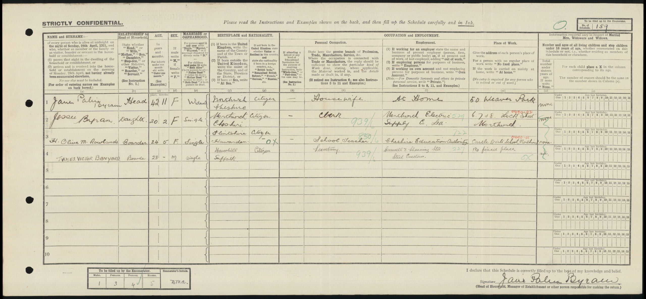 Harriet Olive Mary was now living at 50, Weaver Park, Northwich, Cheshire, England in the household of Jane Palin Byram and her daughter Jessie. H. Olive M. Rowlands was one of two Boarders living there. She was now 24 years old and a School Teacher for the Cheshire education Authority.