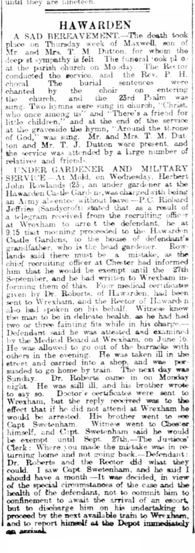 There are two newspaper cuttings regarding Fred Forsyth Rowlands’s brother Herbert John Rowlands’s problems re his Army Service in 1916, a few months after their father’s death in the March of 1916. He was in poor health, please see below.