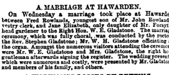 We see that Fred and Jane Elizabeth Rowlands were living at Rectory House, Hawarden, Flintshire, on the 1891 census with Fred’s father John, who was head of the household. John Rowlands, 79 was a Vestry Clerk and had been born in Guilsfield, Montgomery. Fred, 31, was a Stationer and had been born in Hawarden. Jane Elizabeth Rowlands, 24, daughter-in-Law had been born in Radnorshire.