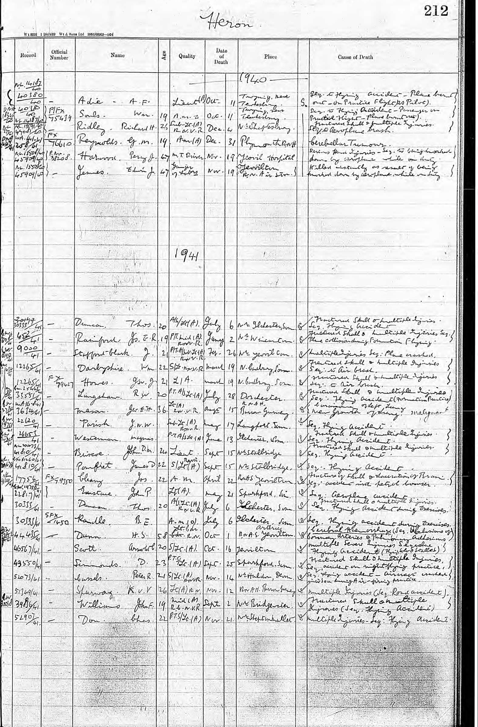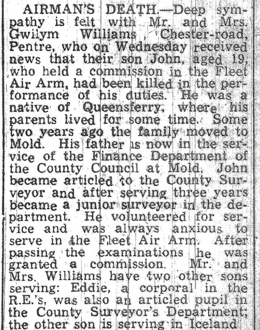 So, John Frederick was to be starting a career in the Fleet Air Arm when he was involved in a Flying accident on the 2nd of September 1941 and the John F. Williams in the UK, British Army and Navy Birth, Marriage and Death Records, 1730-1960 records that – WILLIAMS, John F. Age 19, Mid (A) ROY. N. V. R., Sept 2, Nr. Bridgewater, S. Fractured Skull & multiple injuries (Seq. Flying Accident) (See below).