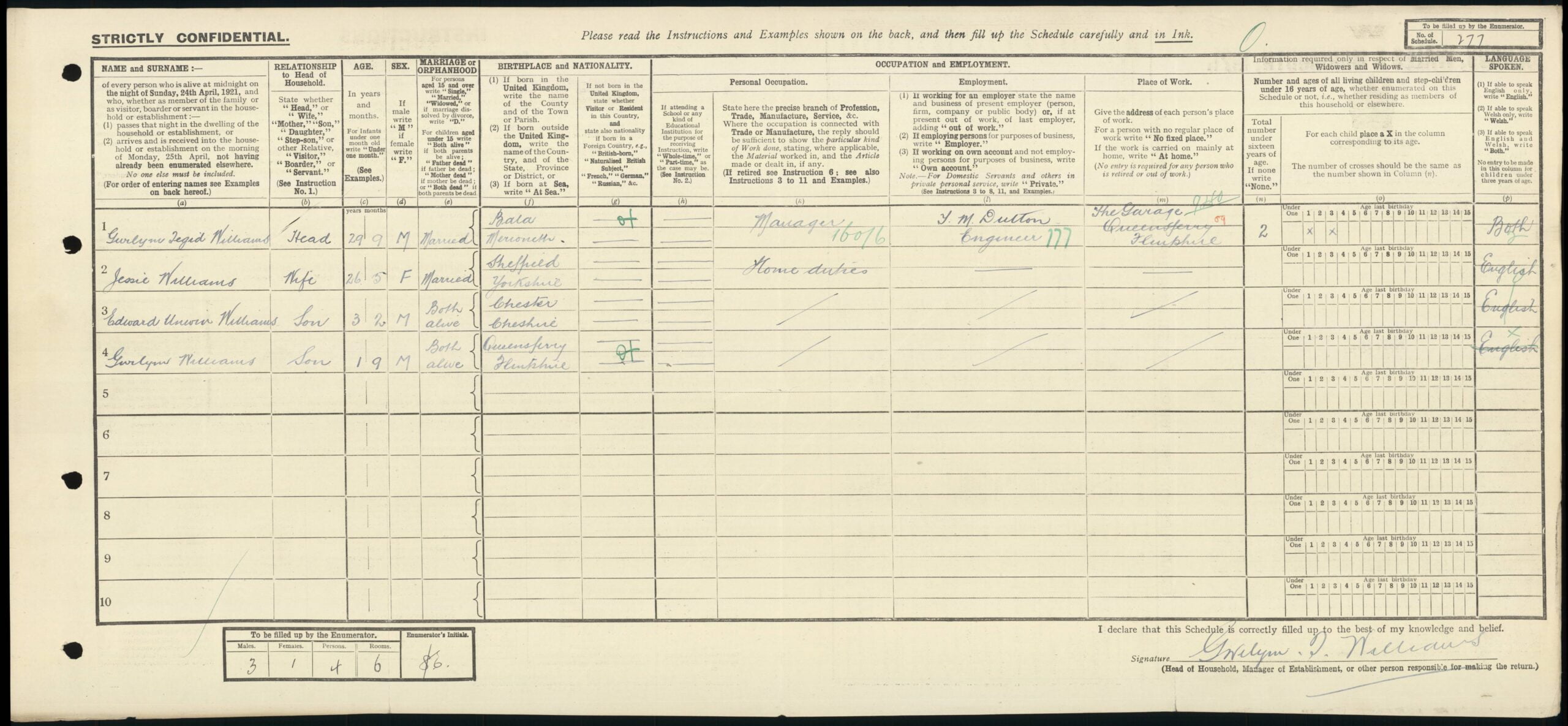 We see the young couple on the 1921 census, which was taken on the 19th of June 1921, living at 23, Dundas Street, Queensferry, Flintshire. Head of the household was Gwilym Tegid Williams, 29 years and 9 months old, born in Bala Merioneth and a Manager at T.M. Dutton, Engineers, The Garage, Queensferry, Flintshire. His wife, Jessie Williams was 26 years and 5 months old, born in Sheffield, Yorkshire and doing ‘Home Duties.’ Their children were Edward Unwin William, age 3 years and 2 months, born in Chester, Cheshire and Gwilym Williams age 1 year and 9 months, born in Queensferry, Flintshire.