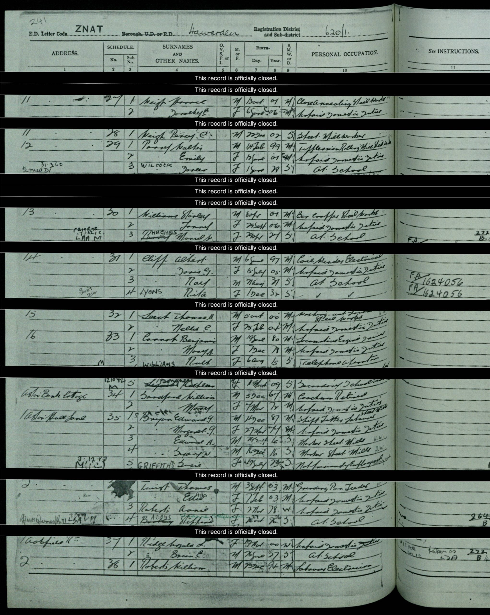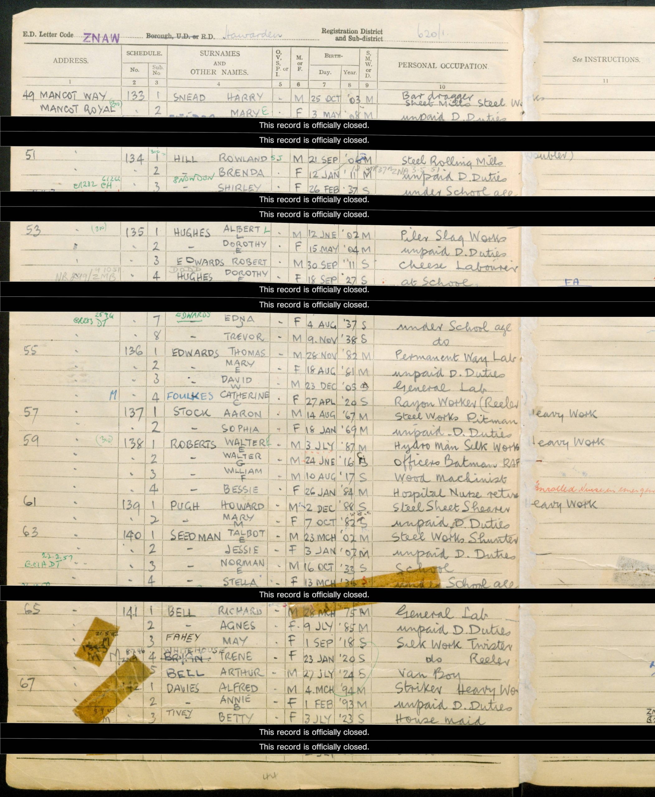 There is an anomaly on the 1939 National Register for the Bell family living at 65 Mancot Way Mancot Royal, Hawarden, Richard Bell was born on the 28th March 1875 and was a general Labourer, Agnes Bell was born on the 9th July 1885 and as most married women on this register who did not have a job was described as “Doing Unpaid Domestic Duties,” Then May Bell born 1st September 1918 and was a Silk Work Twister, She was to marry a gentleman named Fahey. As you see on the Register below, Irene Bell didn’t marry until 1943, but this source shows that there is an Irene Bryan, born on the 23rd January 1920 and she is a Silk Worker, Reeler and she is single. This also tells us the she was to marry to a gentleman called Whitehouse. I do think that this is “our” Irene Bell, and having found the marriage, I am more convinced, as she is described as a widow and her father is Richard Bell. Then there was Arthur Bell born on the 27th July 1924 and was a Van Boy.