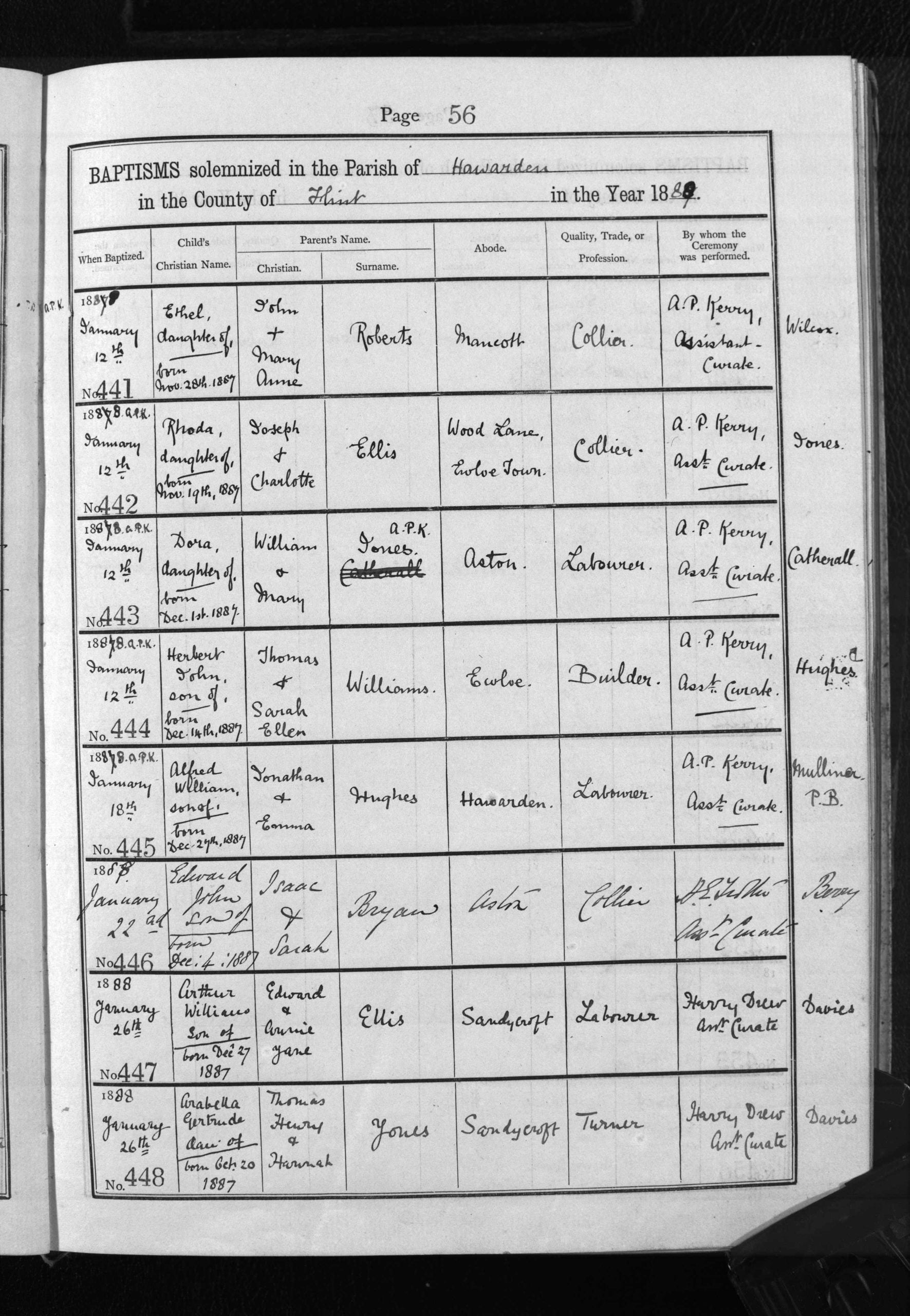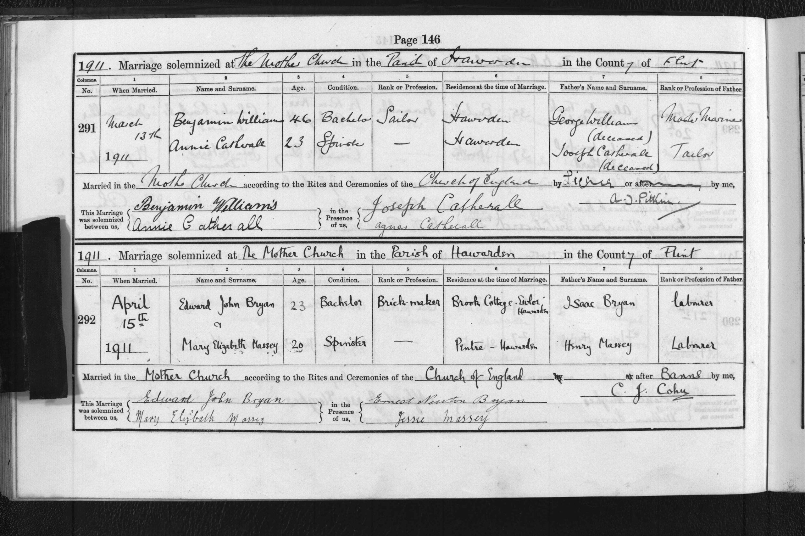 He was the son of Edward John & Mary Elizabeth Bryan (nee Massey) who married in St. Deniol’s Parish Church on the 15th April 1911. Edward John Bryan, 23 and a bachelor, was a Brickmaker, his abode was Brook Cottage, Ewloe, Hawarden, his father Isaac Bryan, Labourer and his bride was Mary Elizabeth Massey, 20 and a spinster, her abode was Pentre, Hawarden, her father Henry Massey, was a Labourer. They married after Banns and their witnesses were Ernest Newton Bryan (Edward John’s brother) and Jessie Massey (nee Massey). I believe that Jessie Massey was the wife of Arthur Massey, Mary Elizabeth’s one remaining sibling of seven children that had been born to her parents Henry & Sarah Massey. On the 1911 census they had told us that they had had 7 children and 5 had died. I have found the burials of their five children and apart from one daughter Gertrude Ann, who died age 8 months early in their marriage, the others were all sons who died in their teens or early twenties in two years between 1904 and 1906, so Mary Elizabeth had suffered many bereavements in her short life, as had her parents Henry & Sarah Massey.
