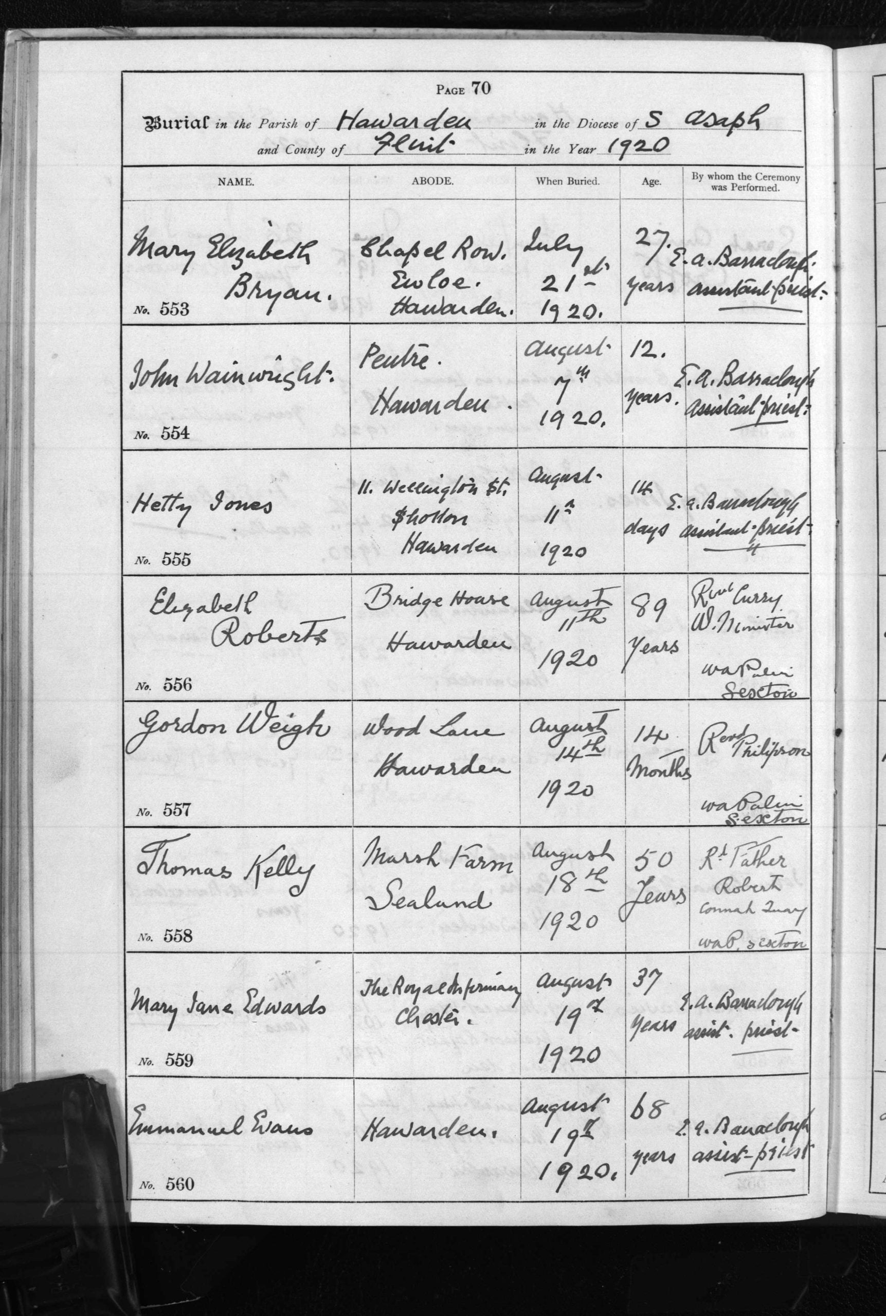 Sadly, I believe that Mary Elizabeth also died in 1920, age 27 years, I found a burial in St. Deniol’s Parish Registers, her address was Chapel Row, Ewloe and she was buried on the 21st July .