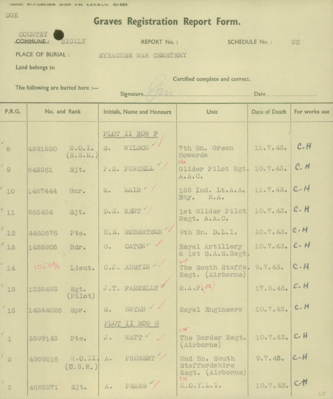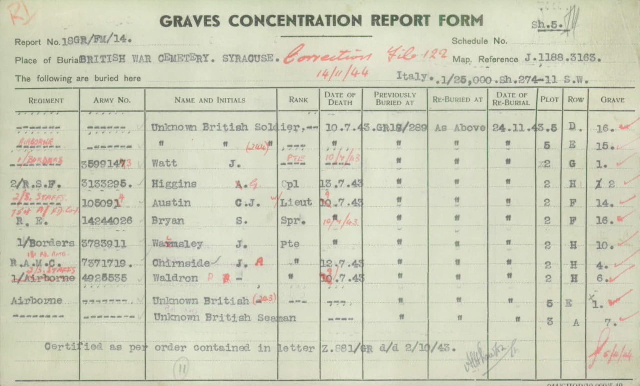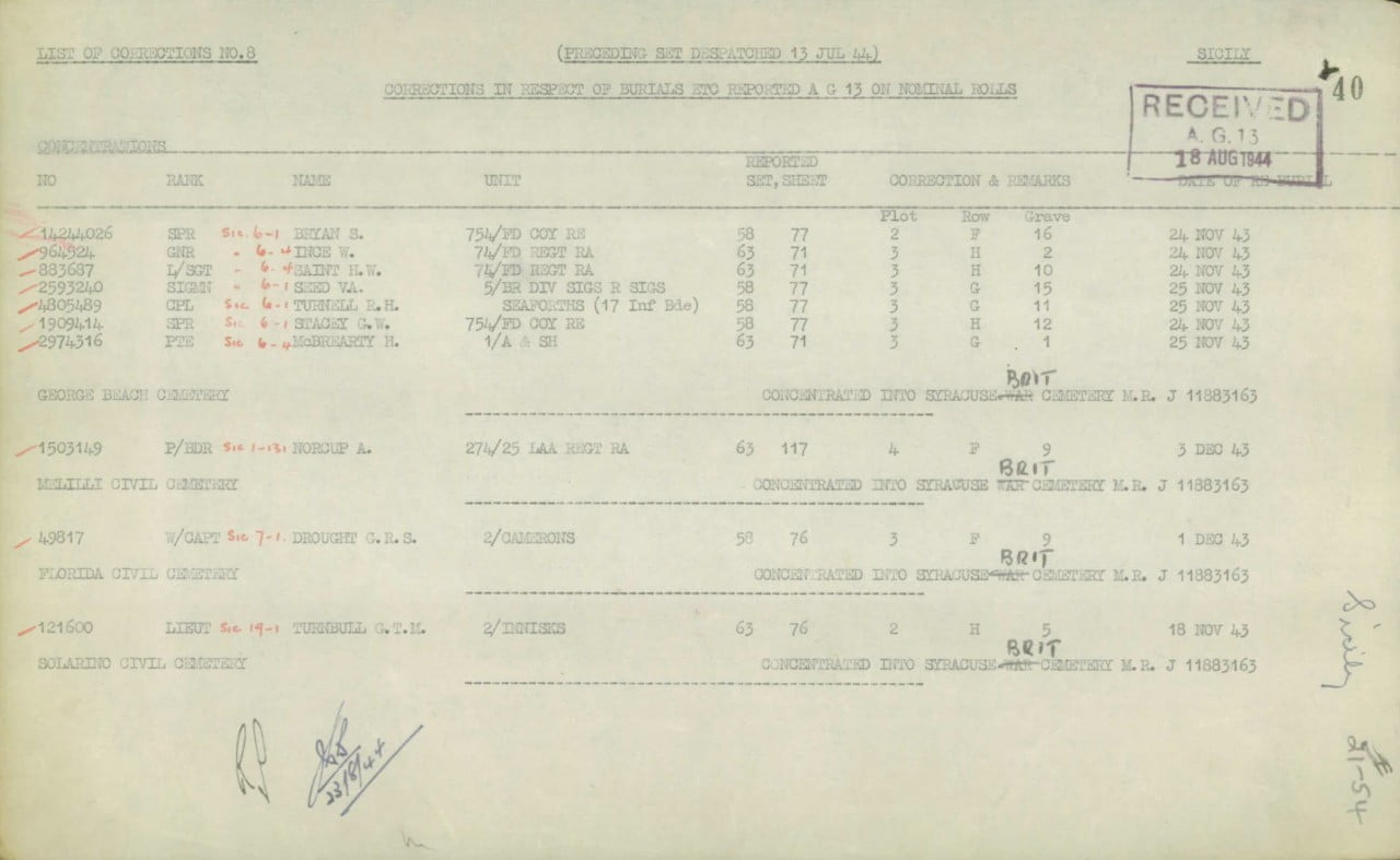 Sydney Walter was probably buried on the day he died, near where he died. The Commonwealth War Graves Concentration Report Form tells us that this was at 43.GRIS/289, but I do not know where that is, but he was reburied on the 24th November 1943 at his resting place at Syracuse War Cemetery.